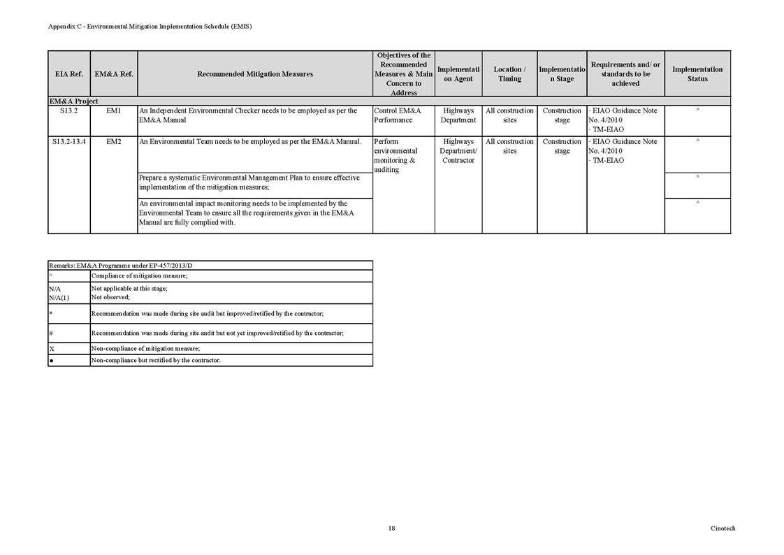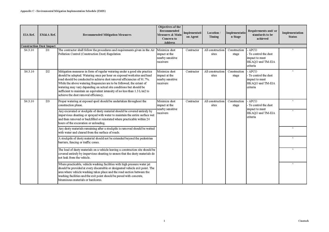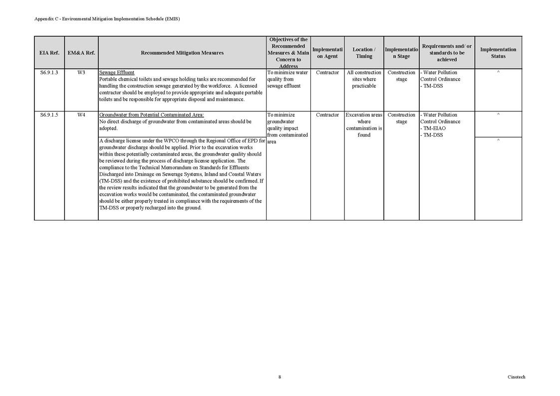 6.3 According to Environmental Permit, the approved EIA Report (Register No.: AEIAR-171/2013), and the EM&A Manual of the Project, the mitigation measures detailed in the documents are recommended to be implemented during the construction phase. An Environmental Mitigation Implementation Schedule (EMIS) is provided in Appendix C.