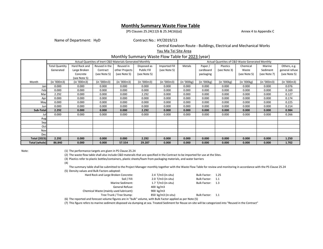 Site audits were carried out on a weekly basis to monitor and audit to ensure that proper storage, transportation and disposal practices of waste materials generated during construction activities, such as construction and demolition (C&D) materials and general refuse are being implemented. The summary of site audits is shown in Table 6.1 of this report. The implementation status of the waste/chemical management measures in the reporting period are summarized in Appendix C.