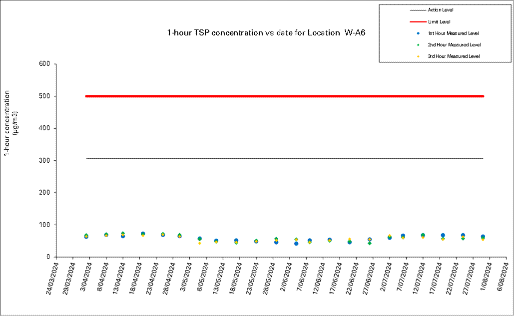 A.7 One Action Level of construction noise was triggered during the reporting month as documented complaints were received. No exceedance of Limit Level of construction noise was recorded in the reporting month. No exceedance of the Action and Limit Level of 24-hour TSP and 1-hour TSP was recorded in the reporting month.