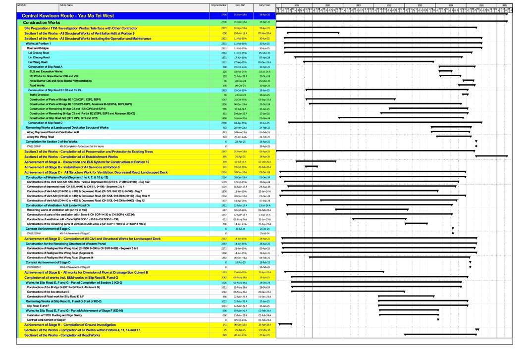 · Along Lin Cheung Road – remaining road works at Portion 1E · Noise Barrier C02 Road Works in progress at Portion 1E · Slip Road A backfilling, footing & wall construction for NB-C06 & V09 at Portion 1E · Parapet Wall at Bridge B, B2, C, C2, D, E & F at Portion 1B, 1G · Road Widening Works at Slip Road E & F in Portion 1A & 1B · Slip Road E & F Road Works including Noise Barrier Installation (NB C01 at Slip Road E) in Portion 1A & 1B · Fire Separation Wall FSW-1 at Segment 1 & 2 in Portion 1B · Fire Separation Wall FSW-3 and FSW-4 at Bridge C2 in Portion 1D · Abutment Wall at Emergency Access Road (West Side) in Portion 1D · Roadworks at Segment 1, 2, 3, 4, 7, 10, 11 & 12A in Portion 1B & 1F · Fire Separation Wall FSW-2 at Segment 10 to 12 in Portion 1F · Façade Wall at Segment 10 to 12 in Portion 1F · Reinforced Concrete works for Escape Route Staircase No. 1 to 2 at Portion 1F and 10 · Upstand Wall and Column construction at Segment 5 (West Side) in Portion 1D · Landscaped Deck construction at Segment 5A in Portion 1D · Reinforced Concrete works (Column) at Segment 8 & 9 and Washout Chamber in Portion 1D · Portal installation for Landscaped Deck construction at Segment 5b, 8b & 9 in Portion 1D · ABWF and E&M at HWR Plant Room Building in Portion 1D |