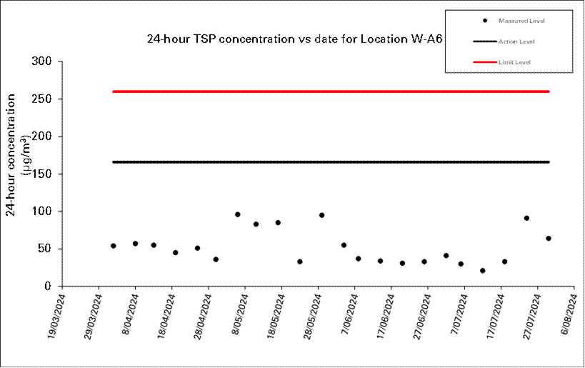 A.7 One Action Level of construction noise was triggered during the reporting month as documented complaints were received. No exceedance of Limit Level of construction noise was recorded in the reporting month. No exceedance of the Action and Limit Level of 24-hour TSP and 1-hour TSP was recorded in the reporting month.