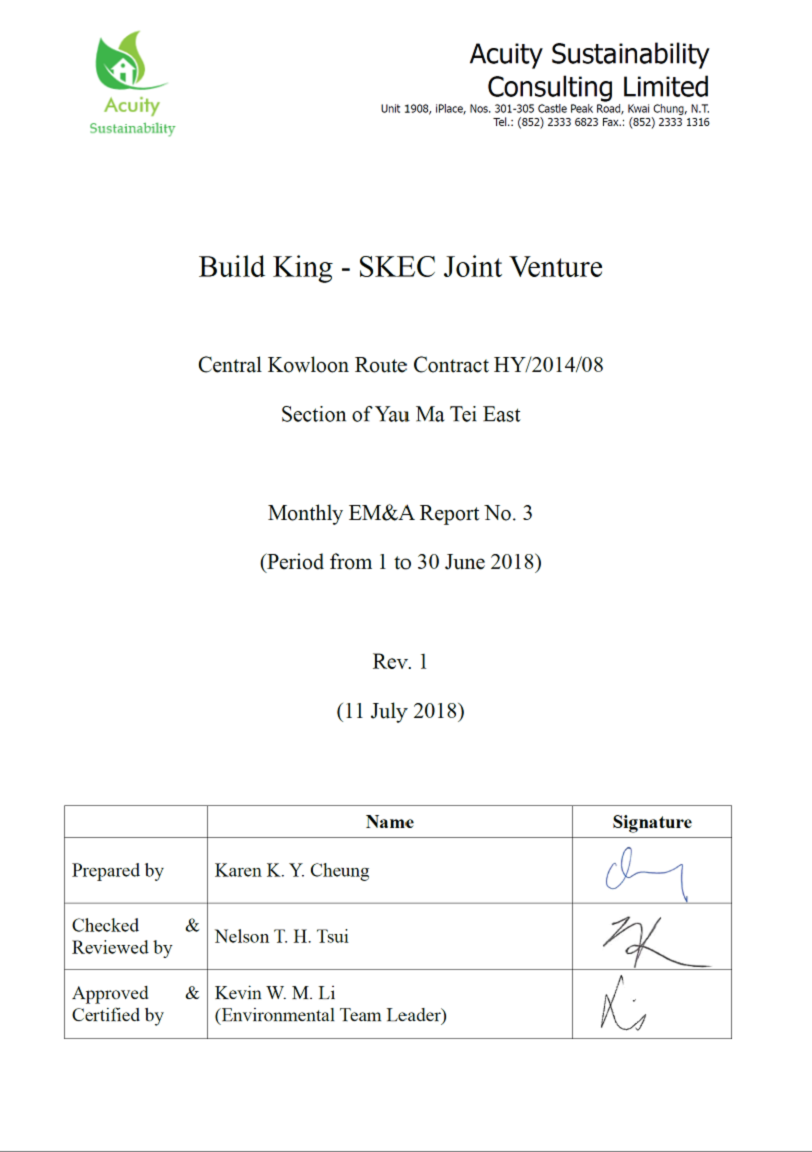 A.1 Build King – SKEC Joint Venture (“Contractor”) commenced the construction works of Highway Department (HyD) Central Kowloon Route Contract No. HY/2014/08 – Section of Yau Ma Tei East (“The Project”) on 20 April 2018. This is the 3rd monthly Environmental Monitoring and Audit (EM&A) report presenting the EM&A works carried out during the period from 1 June 2018 to 30 June 2018.
