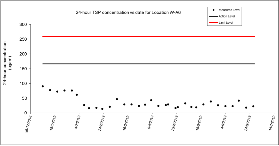 A.10 No exceedance of the Action and Limit Levels of 24-hour TSP and 1-hour TSP monitoring were recorded during the reporting period.