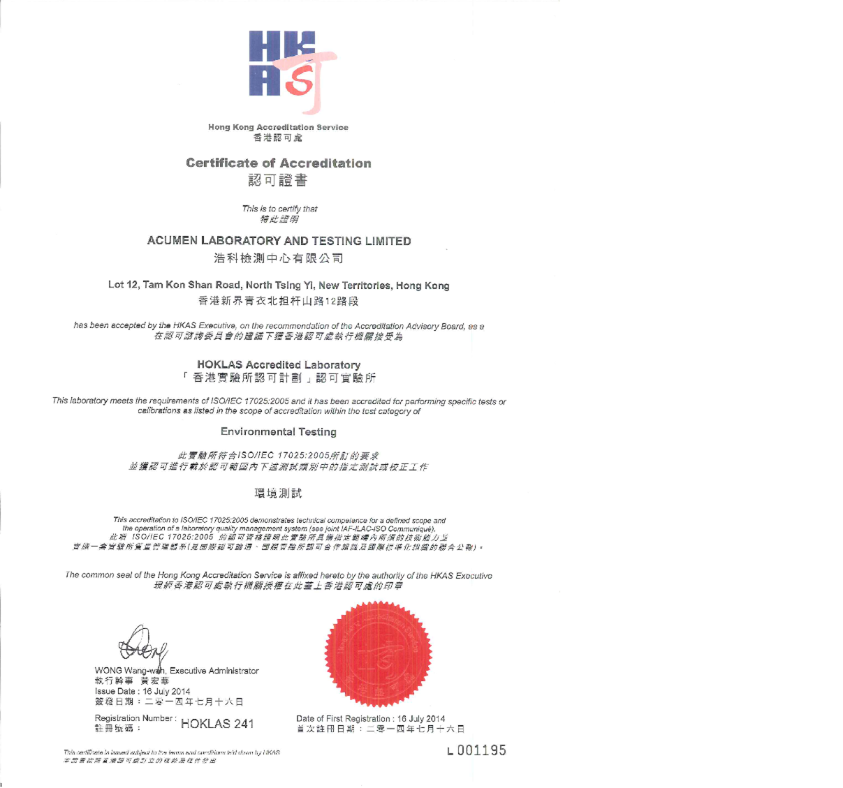 H. The Certification of Laboratory with HOKLAS Accredited Analytical Tests