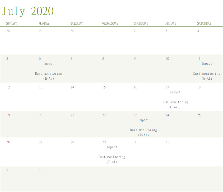 A.5 Bi-weekly inspection of the implementation of landscape and visual mitigation measures by ET was conducted on 10 and 24 June 2020. Details of the audit findings and implementation status are presented in Section 5.