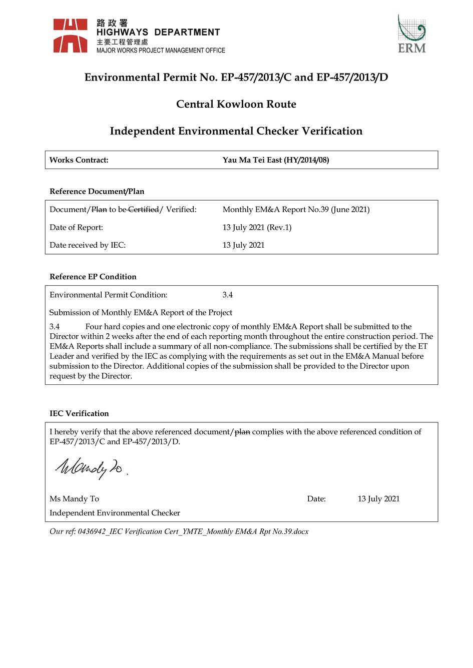 1.2. The Central Kowloon Route – Design and Construction Environmental Impact Assessment Report (Register No.: AEIAR-171/2013) was approved with conditions by the Environmental Protection Department (EPD) on 11 July 2013. An Environmental Permit (EP 457/2013) was issued on 9 August 2013. Variations of EP (VEP) was subsequently applied for and the latest EP (EP-457/2013/C) was issued by EPD on 16 January 2017. A Further EP (FEP-02/457/2013/C) was issued by EPD on 5 March 2018. Variations of EP (VEP) was subsequently applied for and the latest EP (EP-457/2013/C) was issued by EPD on 15 June 2021.