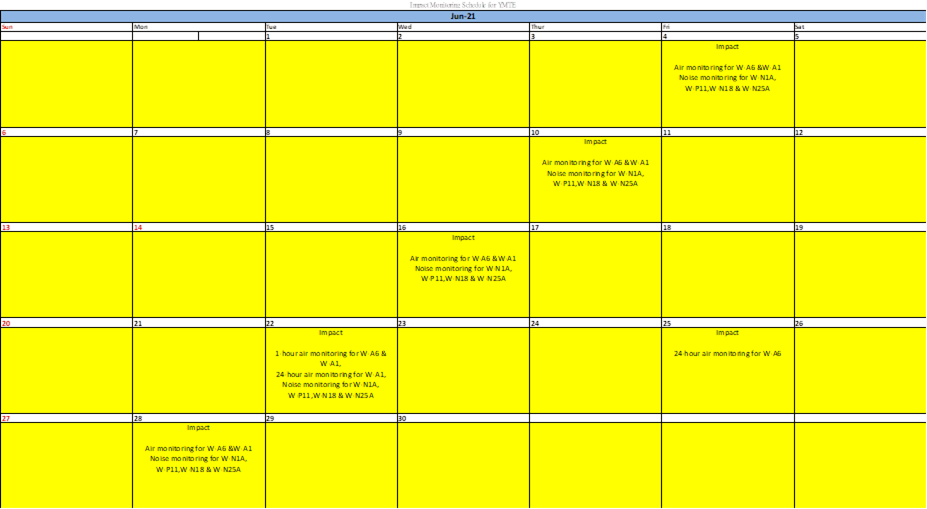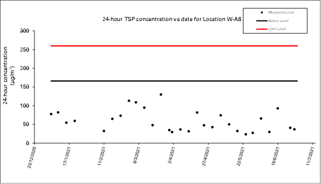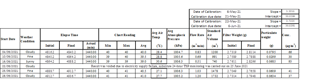 A.7 Due to the electricity supply failure for the high volume sampler (HVS) on 22 June 2021 at Man Cheong Building (W-A6), 24-hour TSP result was voided. Inspection and repair works for the electricity supply were conducted by the Contractor on 24 June 2021. Additional monitoring for 24-hour TSP at W-A6 was arranged on 25 June 2021. The result was valid and used as a substitute for the voided monitoring result on 22 June 2021.