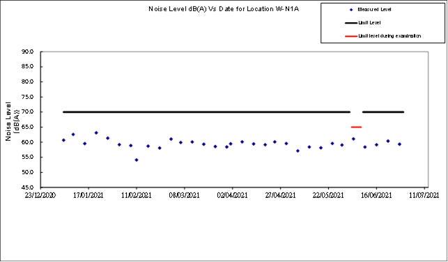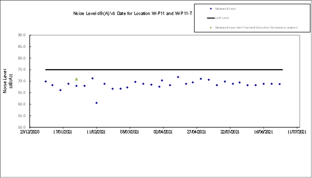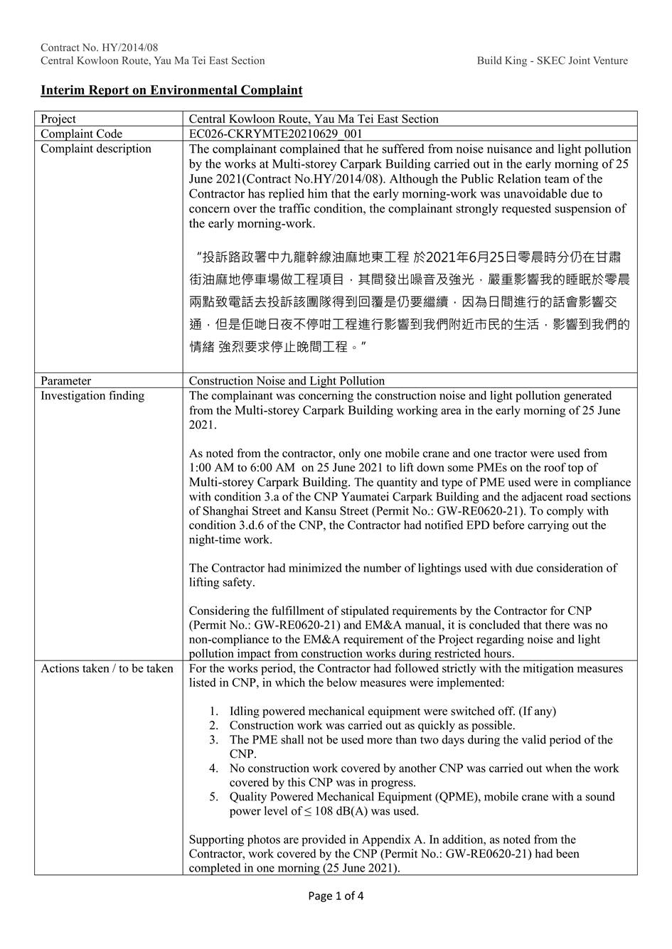 A.9 One noise-related and light pollution-related complaint was received on 29 June 2021. After investigation with Contractor, precautionary measures had been proposed to the Contractor by ET. The interim report for the complaint is shown in Appendix Q.
