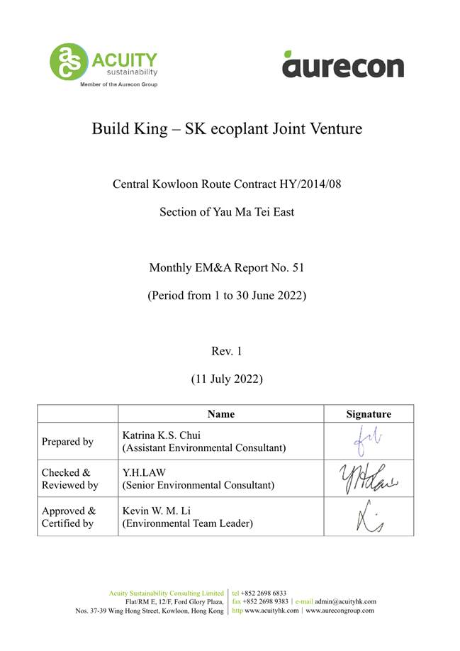 A.1 Build King – SK ecoplant Joint Venture (“Contractor”) commenced the construction works of Highway Department (HyD) Central Kowloon Route Contract No. HY/2014/08 – Section of Yau Ma Tei East (“The Project”) on 20 April 2018. This is the 51st monthly Environmental Monitoring and Audit (EM&A) report presenting the EM&A works carried out during the period from 1 June 2022 to 30 June 2022.