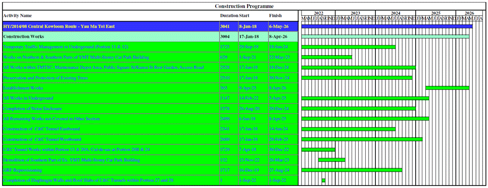 · Construct D-wall panels, pumping test, excavation to roof slab & construct roof slab at Zone B · Construct D-walls, buttress walls, install king posts/RW/OW/PW, construct traffic deck and carry out pumping test at Zone B · Construct D-walls, buttress walls, install king posts/RW/OW/PW, construct roof slab, traffic deck and carry out pumping test at Zone C · Construct D-walls/Pipe Piles, buttress walls, install king posts/RW/OW/PW, construct traffic deck and carry out pumping test at Zone D · Divert DN 900 sewer pipes, demolition of CLP Cable Tunnel A and handover back to CLP, Jet Grouting at Zone F/B3 · Construct pipe piles & divert DN1800 drainage at Zone G & implement TTA at Zone G · Construct portal frame across, demolish existing Gascoigne Road flyover beams and construct end span at Portion 21 · Construct bridge deck for spans P4 and P6 include bottom tendon stressing at Gascoigne Road flyover. · Construct socketed H-piles, pile caps, ground beams and erect steel posts of Noise Enclosure at Zone 3. · Underground Utilities diversion, construct permanent & temporary pipe piles, barrette walls for Noise Enclosure at Zone 2. |