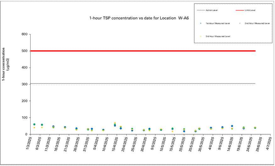 A.7 No action Level of construction noise was triggered during the reporting month. No exceedance of Limit Level of construction noise was recorded in the reporting month. No exceedance of the Action and Limit Level of 24-hour TSP and 1-hour TSP was recorded in the reporting month.