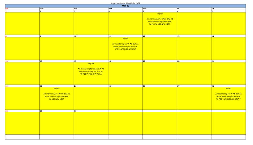A.4 Noise monitoring station at the Coronation Tower 1 (W-P11) and Prosperous Garden Block 1 (W-N25A) were temporarily suspended from 19 March 2020 to 1 April 2020 and 24 March 2020 to 6 April 2020, respectively, due to a case of novel coronavirus infection at the Coronation Tower 7 and Prosperous Garden Block 4. There was no noise monitoring conducted at W-P11 on 23 March 2020. Temporary alternative noise monitoring locations, W-P11-T and W-N25A-T were used to conduct noise monitoring on 28 March 2020. Details of temporary alternative monitoring locations are presented in Temporary Alternative Proposal for Monitoring Station as proposed by ET and agreed by IEC dated 27 March 2020.
