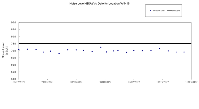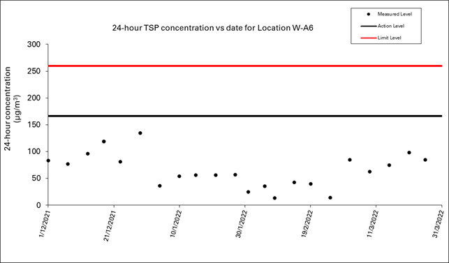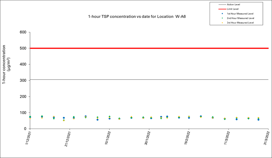 A.7 One Action Level of construction noise was triggered during the reporting period as one documented complaint was received on 15 March 2022 related to construction noise from works areas at Portion 1D. No exceedance of Limit Level of construction noise was recorded in the reporting month. No exceedance of the Action and Limit Levels of 24-hour TSP and 1-hour TSP was recorded during the reporting month.