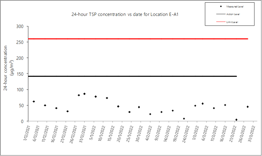A.7 No exceedance of the Action and Limit Levels of 24-hour TSP and 1-hour TSP monitoring were recorded during the reporting month.