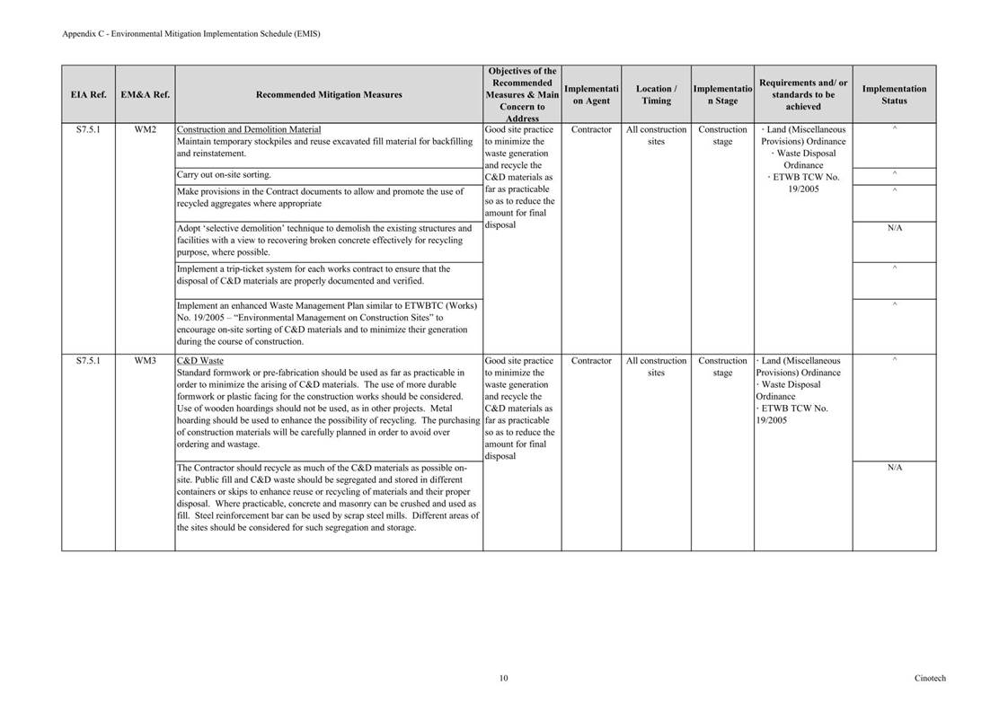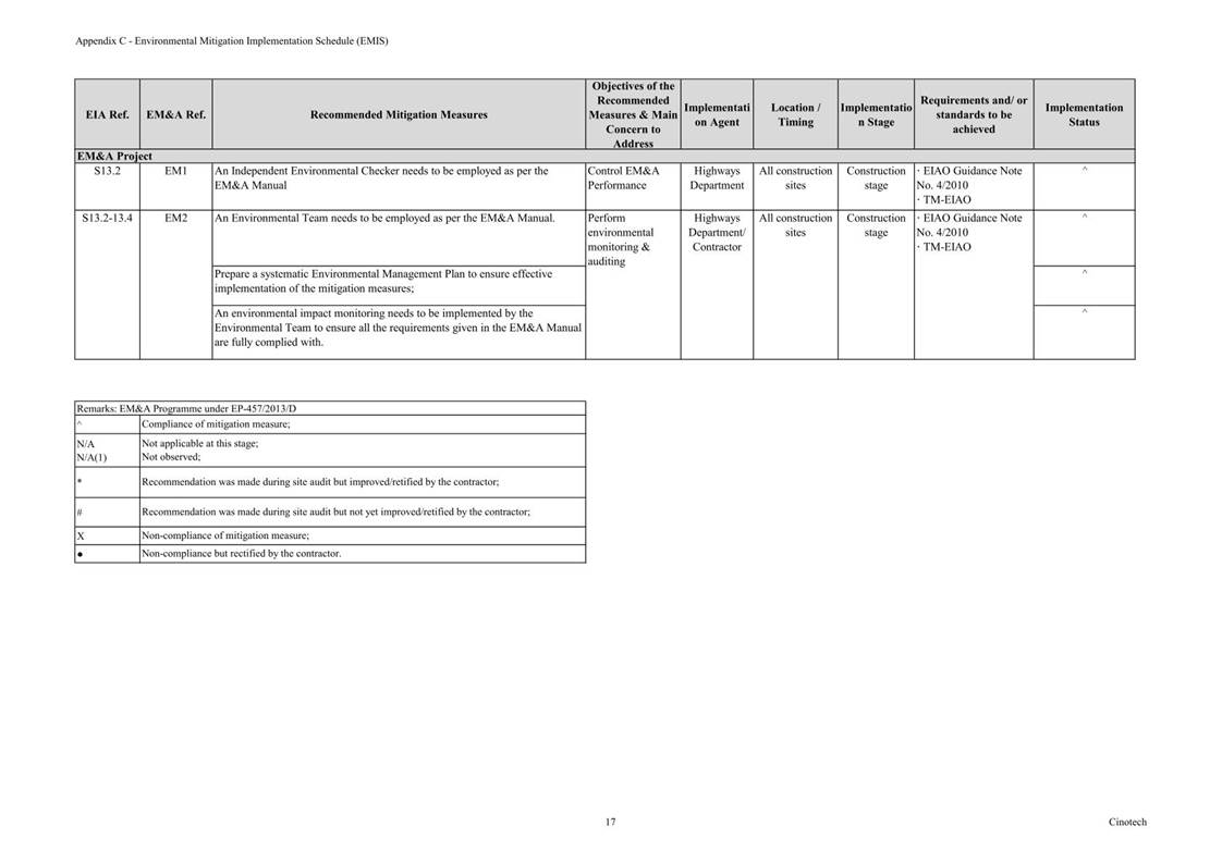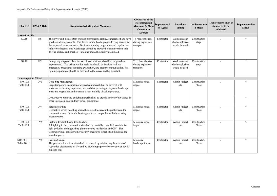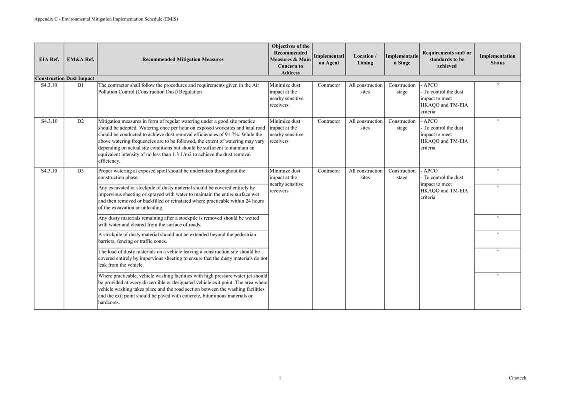 According to Environmental Permit, the approved EIA Report (Register No.: AEIAR-171/2013), and the EM&A Manual of the Project, the mitigation measures detailed in the documents are recommended to be implemented during the construction phase. An Environmental Mitigation Implementation Schedule (EMIS) is provided in Appendix C.
