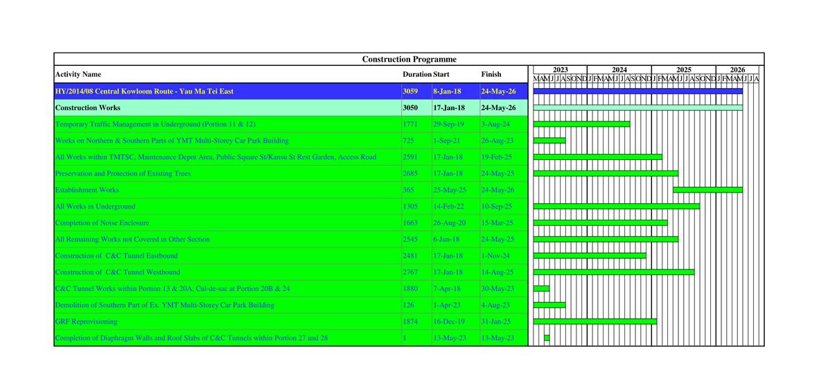 1.3.     The construction of the CKR had been divided into different sections. This Contract No. HY/2014/08 – Section of Yau Ma Tei East (YMTE) covers part of the construction activities located at Yau Ma Tei under the EP and FEP which includes:
