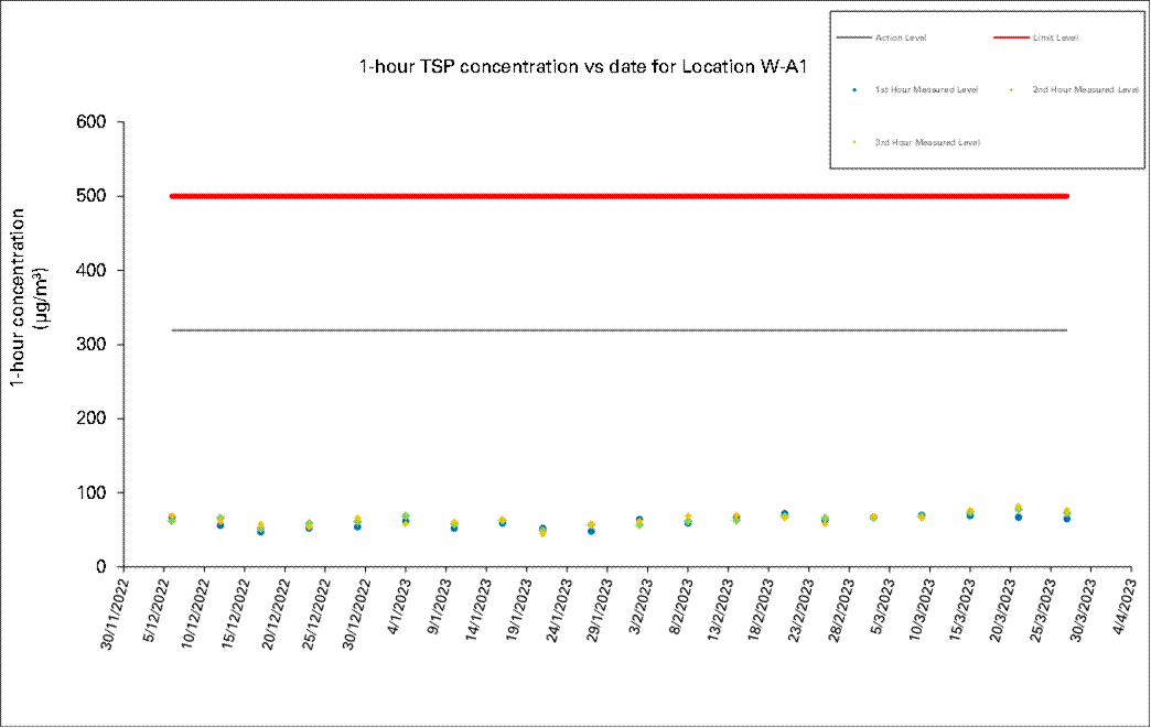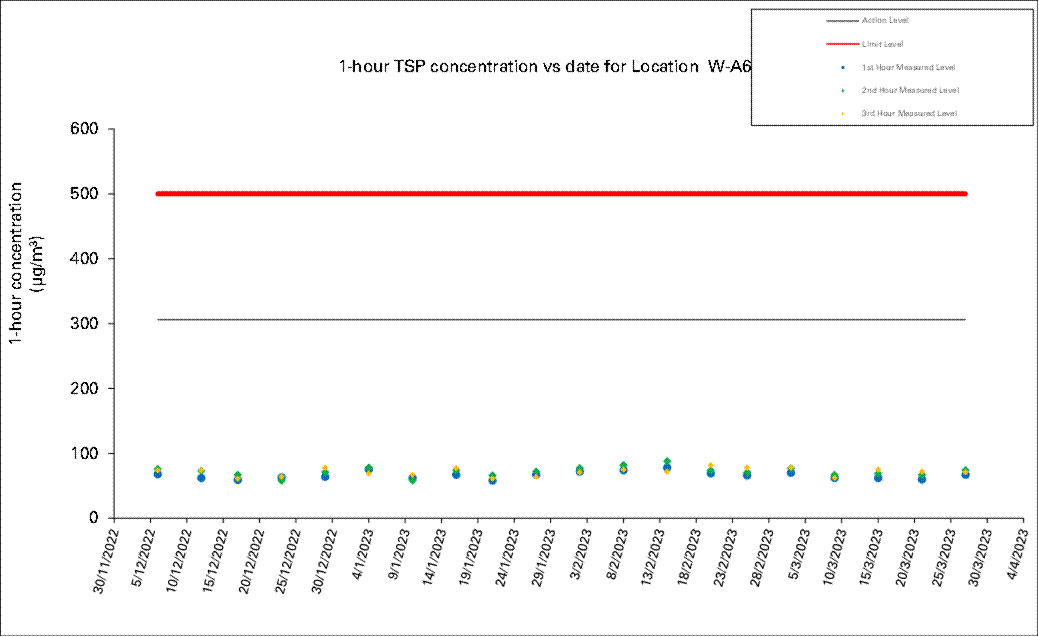 A.7          Six Action Levels of construction noise were triggered during the reporting month as documented complaints were received. No exceedance of Limit Level of construction noise was recorded in the reporting month. No exceedance of the Action and Limit Level of 24-hour TSP and 1-hour TSP was recorded in the reporting month.