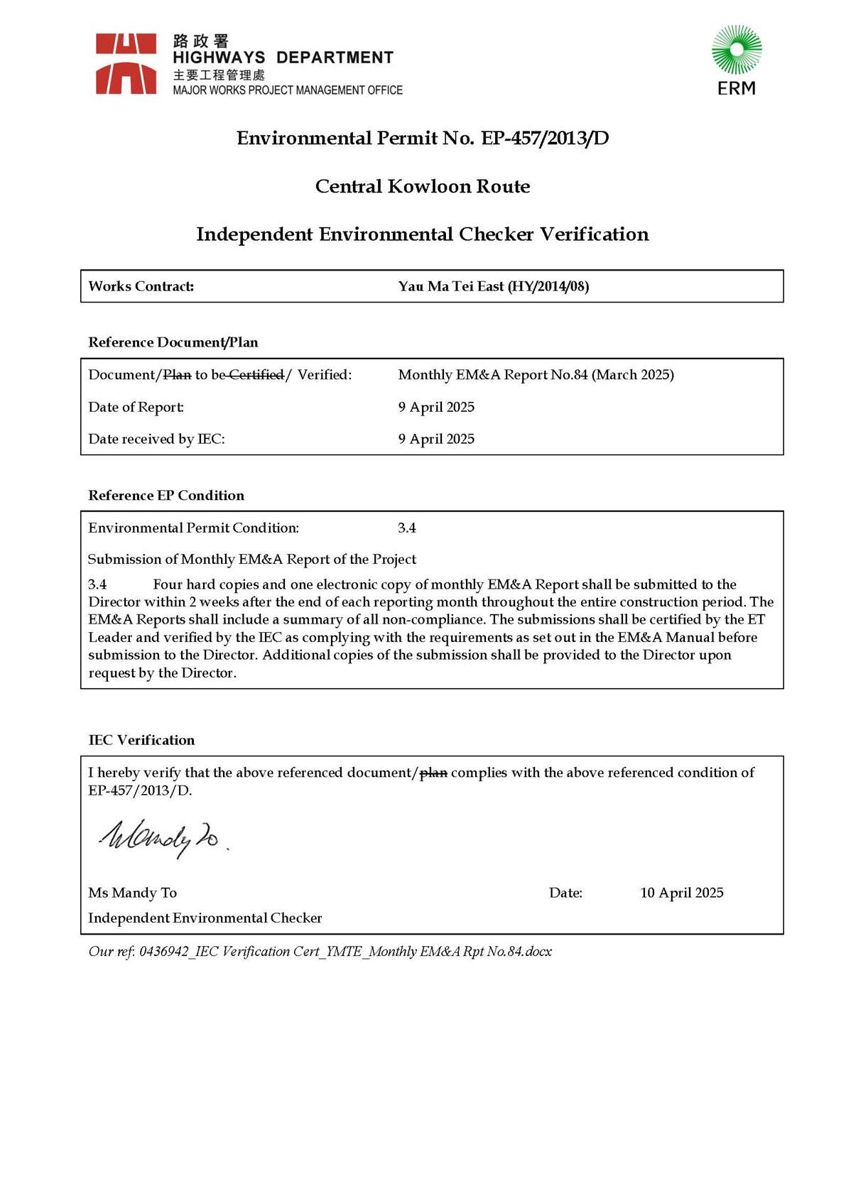 A.1         Build King – SK ecoplant Joint Venture (“Contractor”) commenced the construction works of Highway Department (HyD) Central Kowloon Route Contract No. HY/2014/08 – Section of Yau Ma Tei East (“The Project”) on 20 April 2018. This is the 84th monthly Environmental Monitoring and Audit (EM&A) report presenting the EM&A works carried out during the period from 1 March 2025 to 31 March 2025.