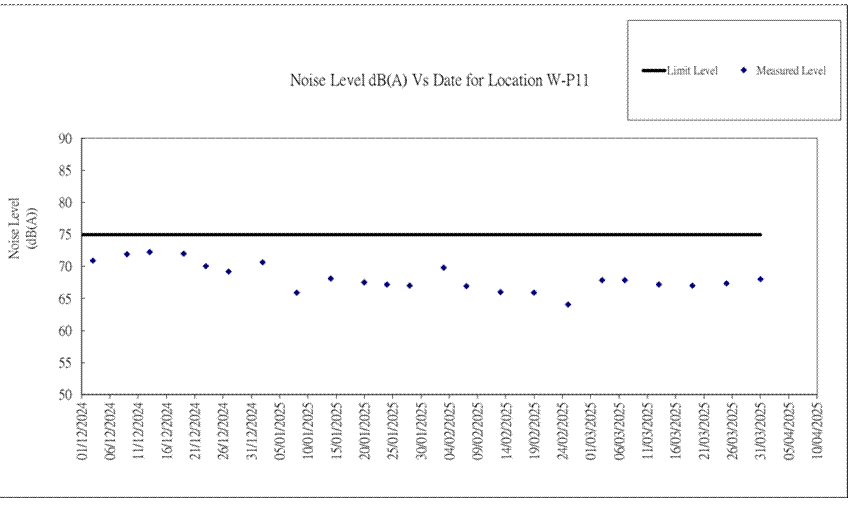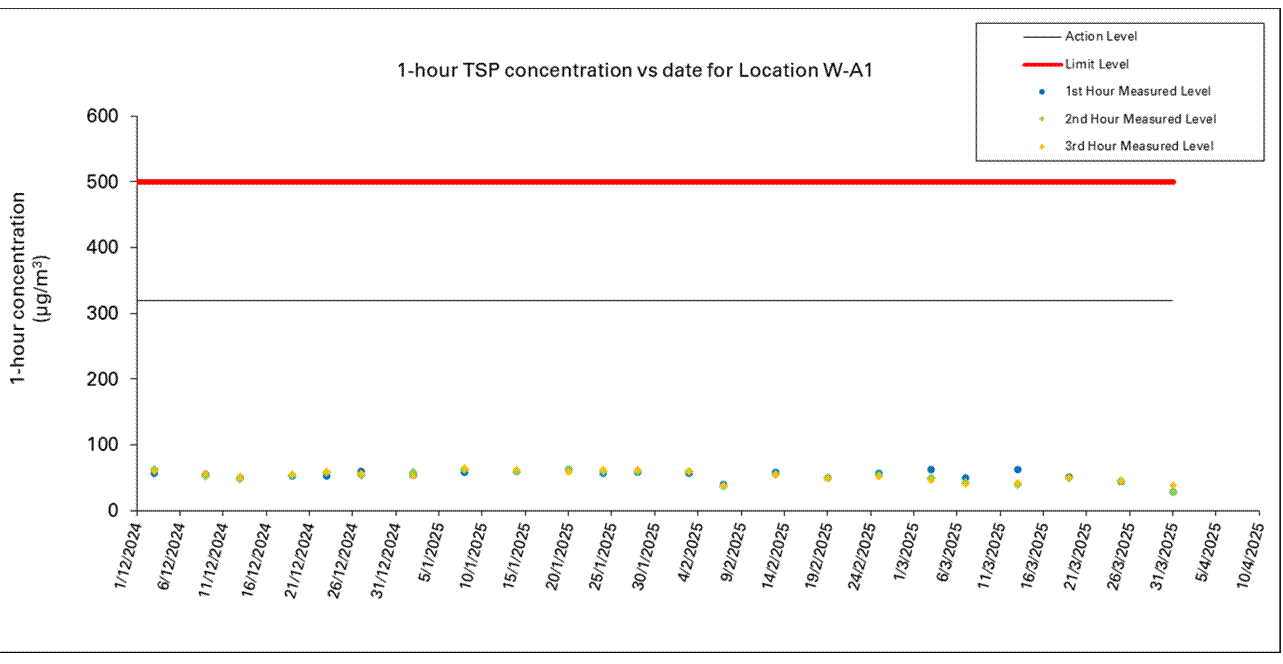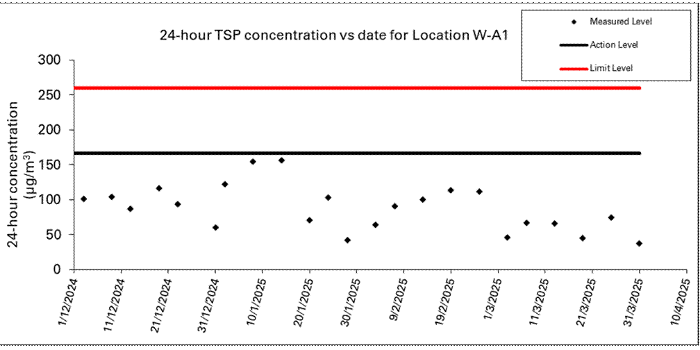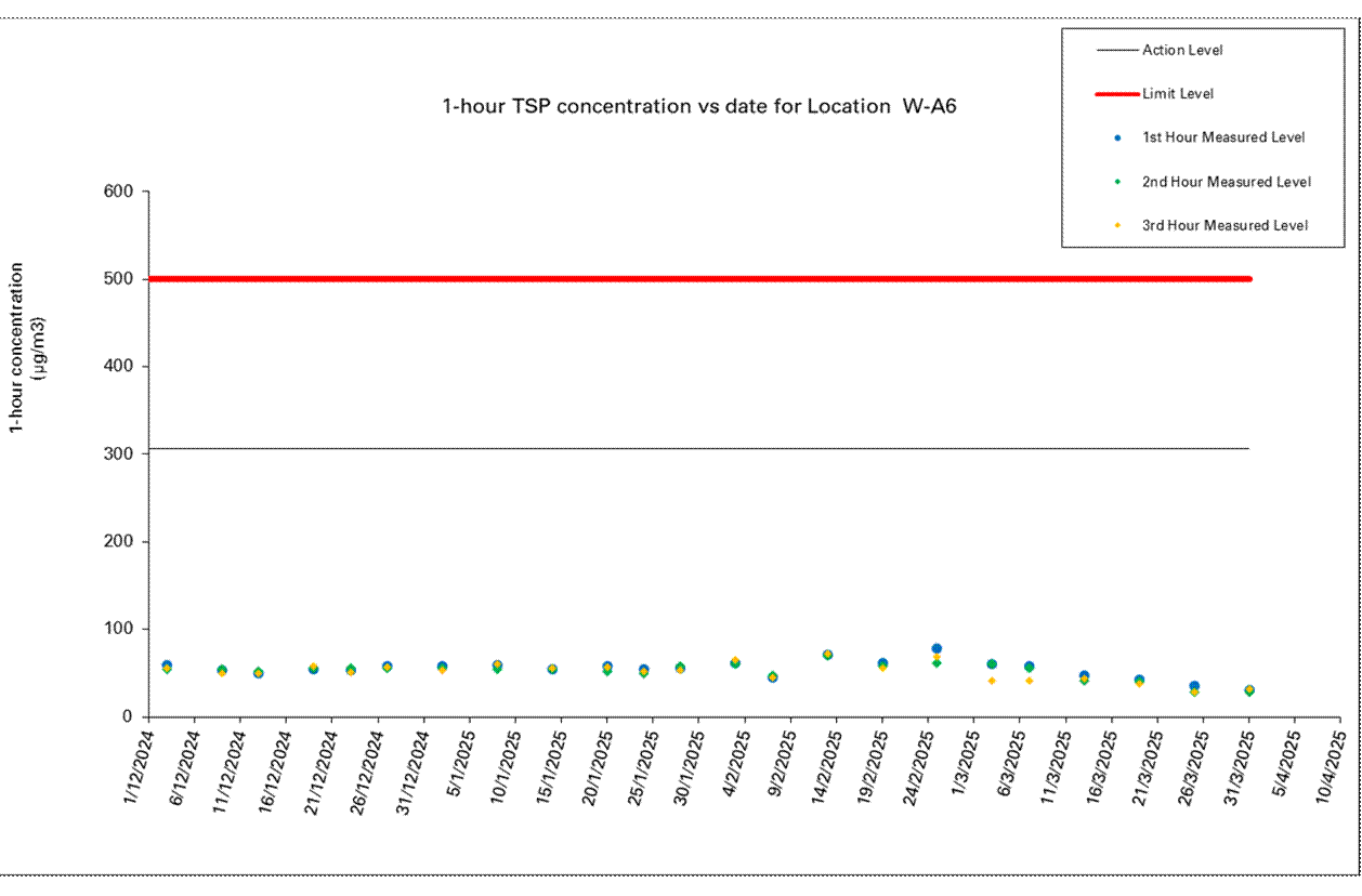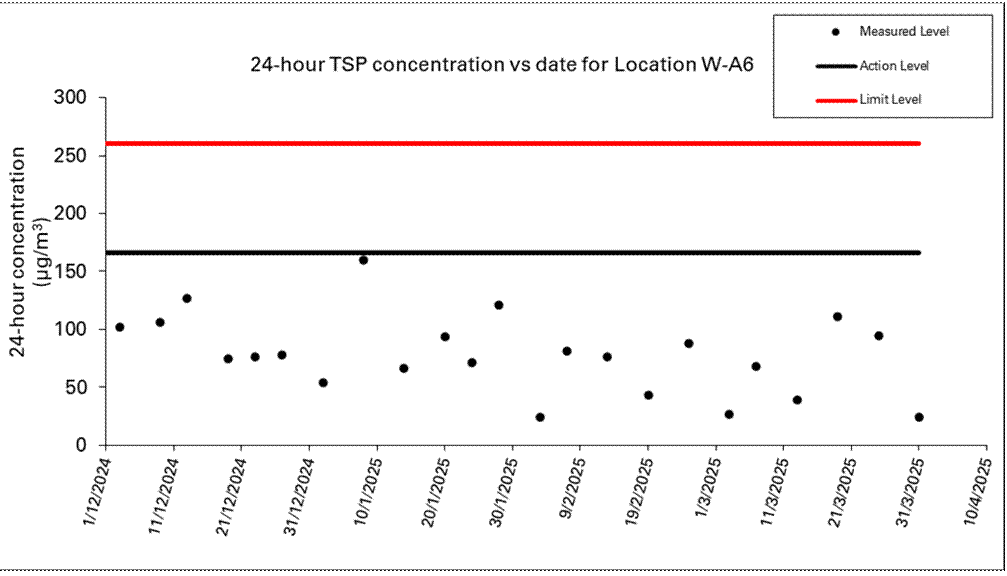 A.7         One Action Level of construction noise was triggered during the reporting month as a documented complaint was received. No exceedance of Limit Level of construction noise was recorded in the reporting month. No exceedance of the Action and Limit Level of 24-hour TSP and 1-hour TSP was recorded in the reporting month.