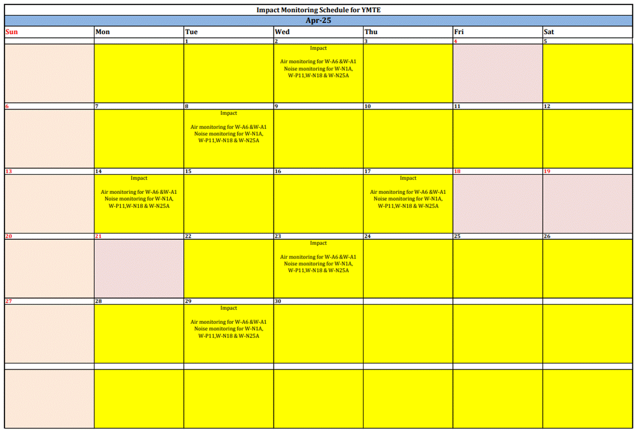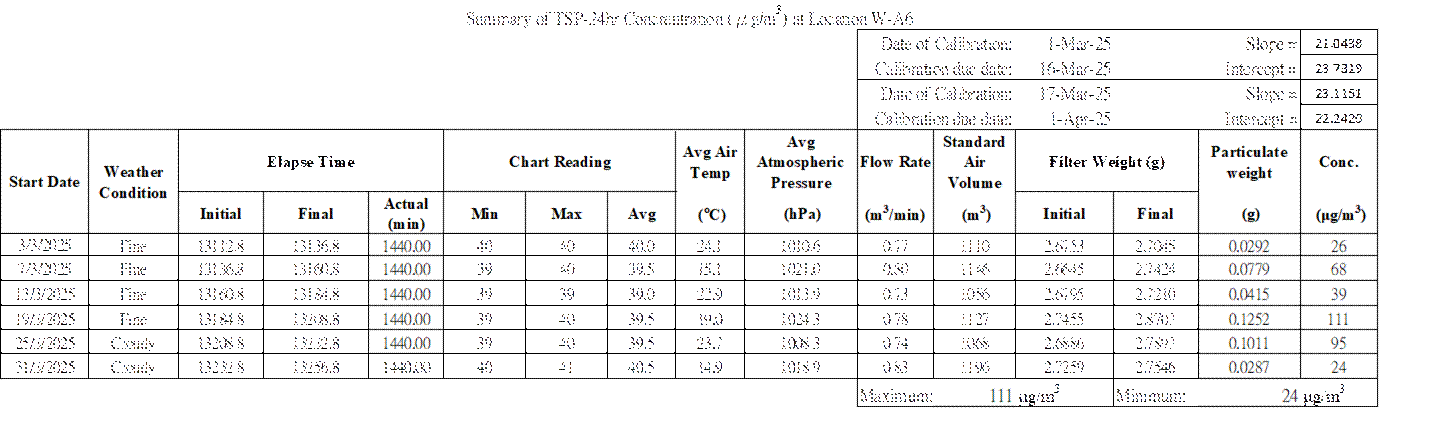A.5         Joint weekly site inspections were conducted by representatives of the Environmental Team (ET), Contractor and Engineer on 6, 13, 20 and 27 March 2025. One joint site inspection with IEC was also undertaken on 13 March 2025. Details of the audit findings and implementation status are presented in Section 5.
