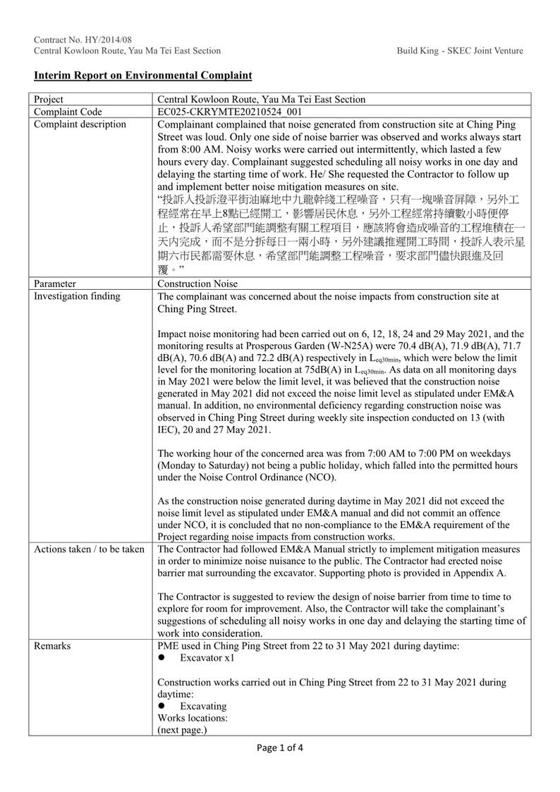 A.8 Two noise-related complaints were received on 7 and 24 May 2021. After investigation with Contractor, precautionary measures had been proposed to the Contractor by ET. The interim reports for the complaints are shown in Appendix Q.