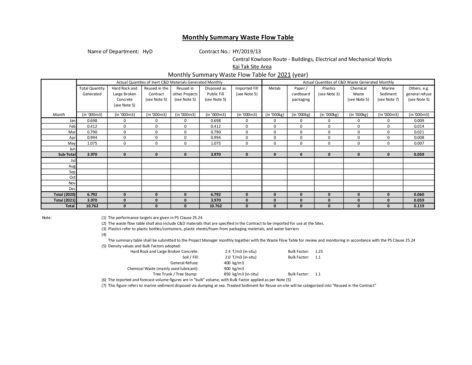 A.1 Alchmex – Paul Y Joint Venture (“Contractor”) commenced the construction works of Highway Department (HyD) Central Kowloon Route Contract No. HY/2018/02 – Section of Kai Tak East (“The Project”) on 9 September 2019. This is the 21st monthly Environmental Monitoring and Audit (EM&A) report presenting the EM&A works carried out during the period from 1 May 2021 to 31 May 2021.