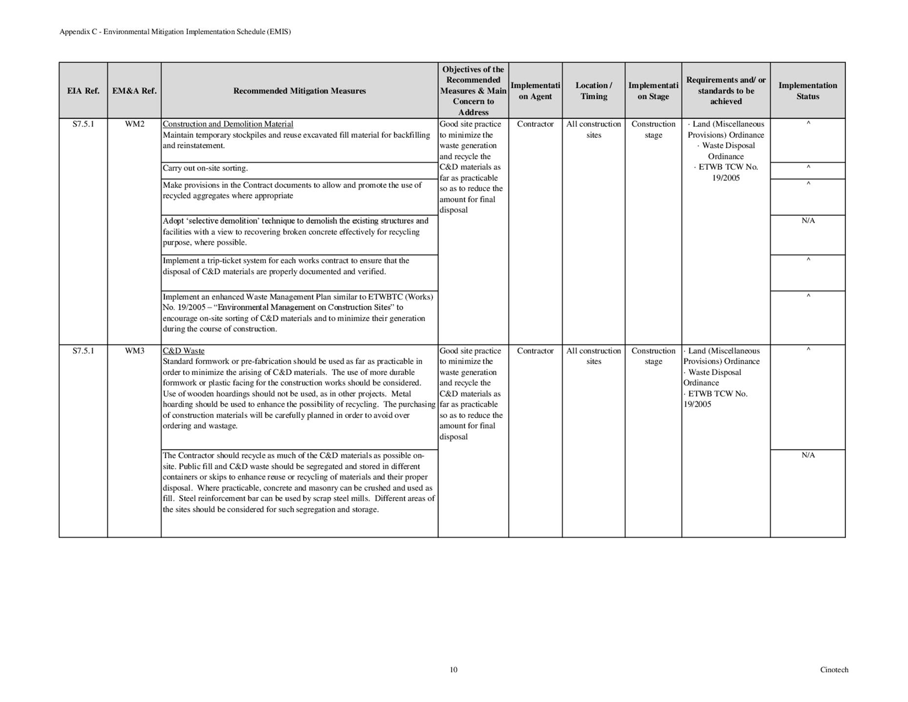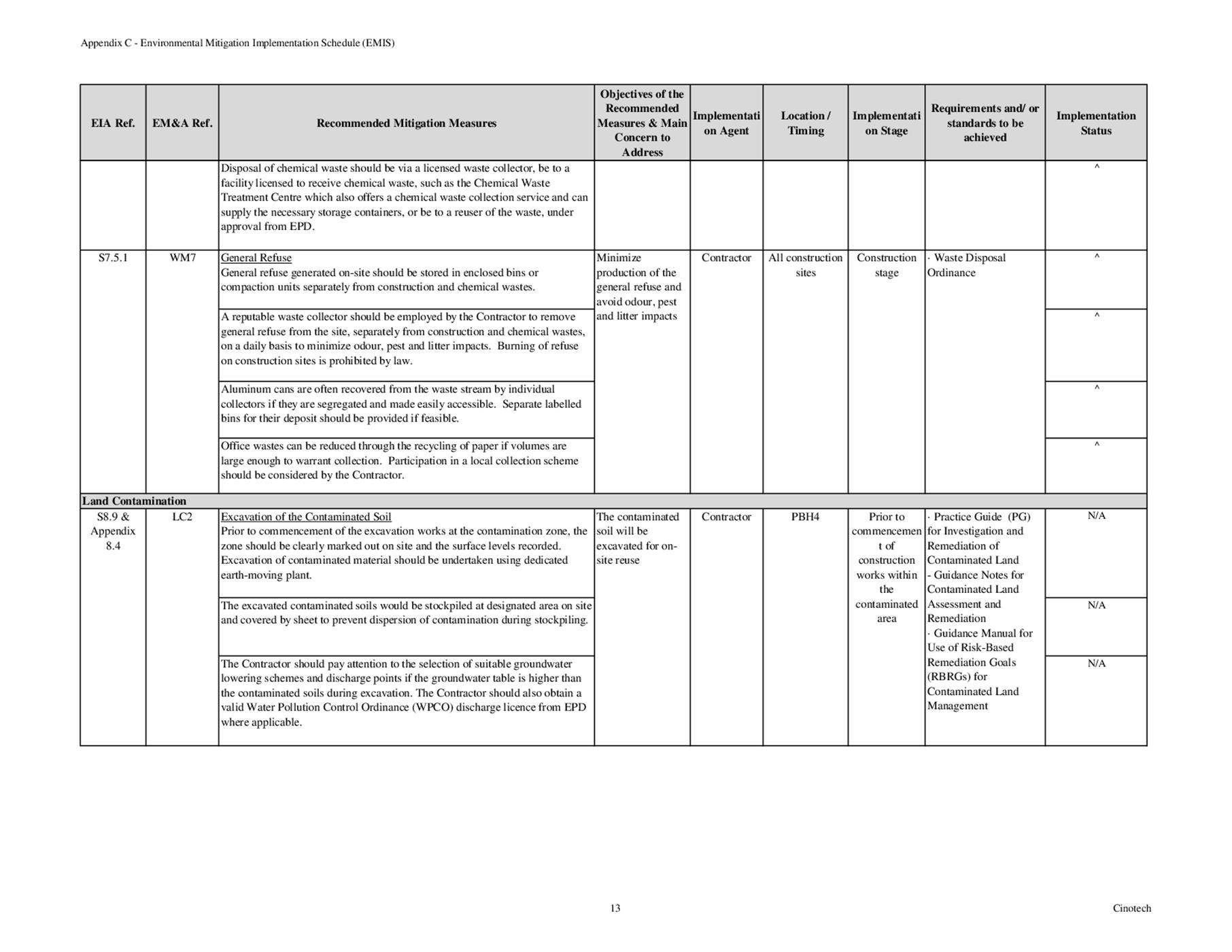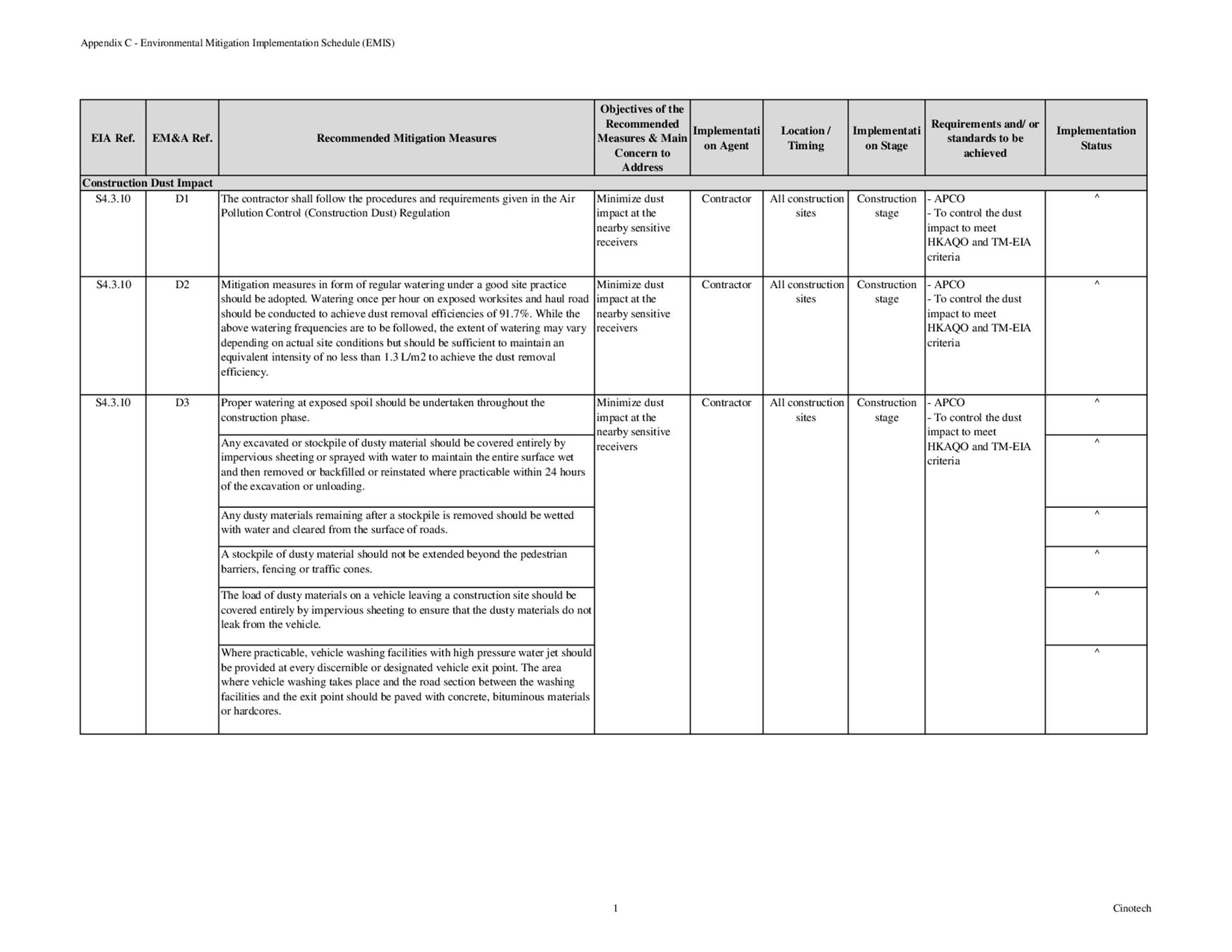 6.3 According to Environmental Permit, the approved EIA Report (Register No.: AEIAR-171/2013), and the EM&A Manual of the Project, the mitigation measures detailed in the documents are recommended to be implemented during the construction phase. An Environmental Mitigation Implementation Schedule (EMIS) is provided in Appendix C.