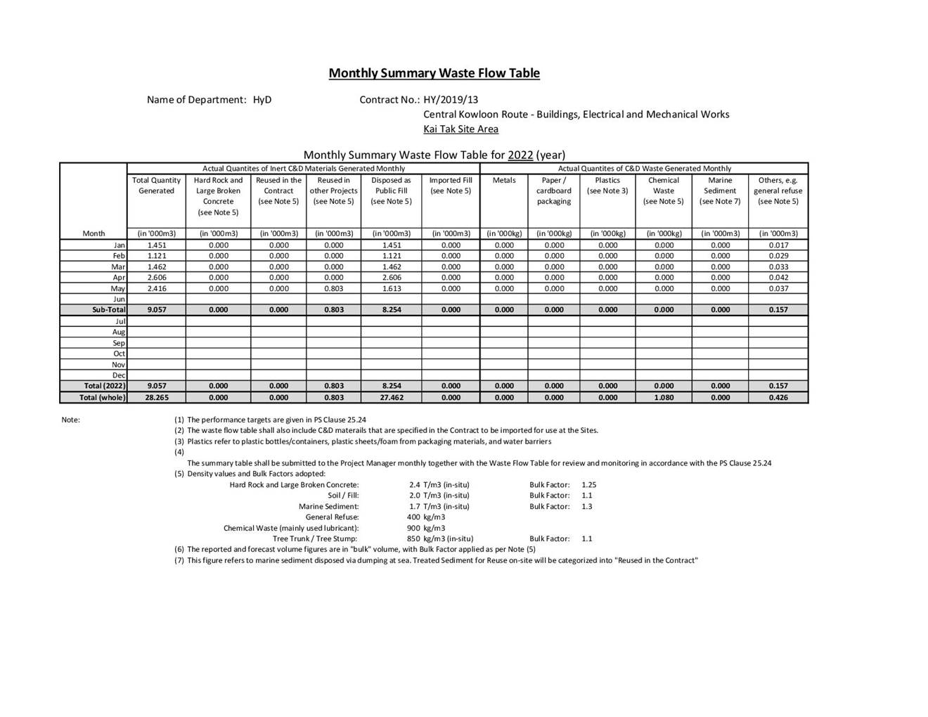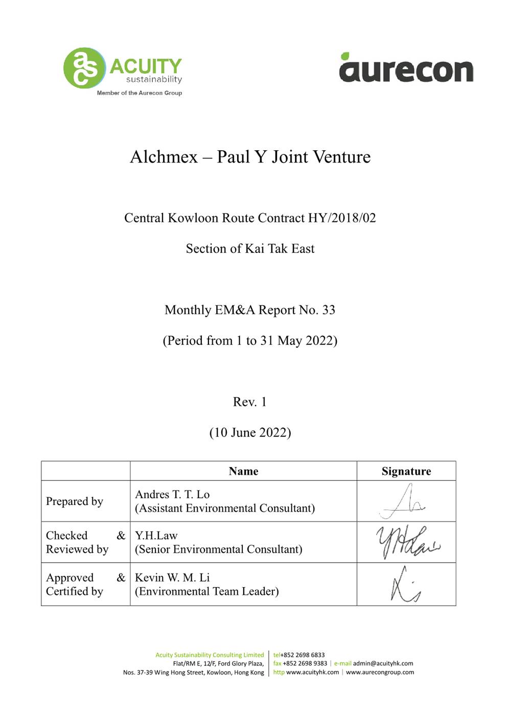 A.1 Alchmex – Paul Y Joint Venture (“Contractor”) commenced the construction works of Highway Department (HyD) Central Kowloon Route Contract No. HY/2018/02 – Section of Kai Tak East (“The Project”) on 9 September 2019. This report is the 33rd monthly Environmental Monitoring and Audit (EM&A) report presenting the EM&A works carried out during the period from 1 May 2022 to 31 May 2022.