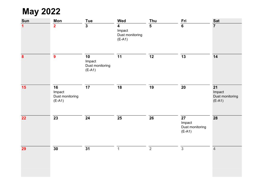 2.3 Site audits were carried out on a weekly basis to monitor and audit the timely implementation of air quality mitigation measures within the site boundaries of this Project. The summary of site audits are shown in Table 6.1 of this report.