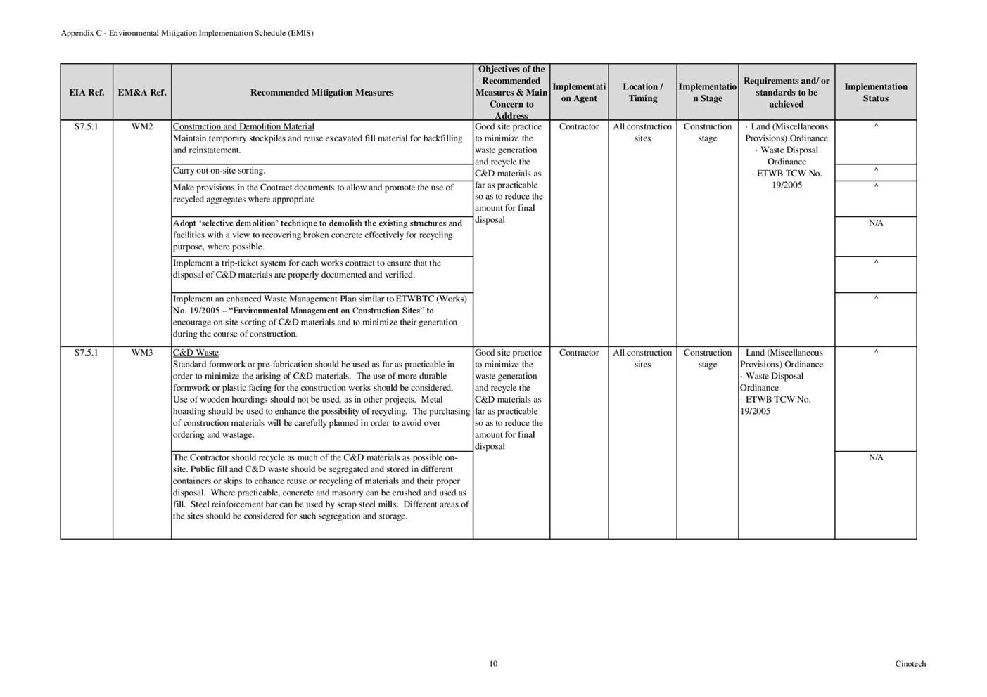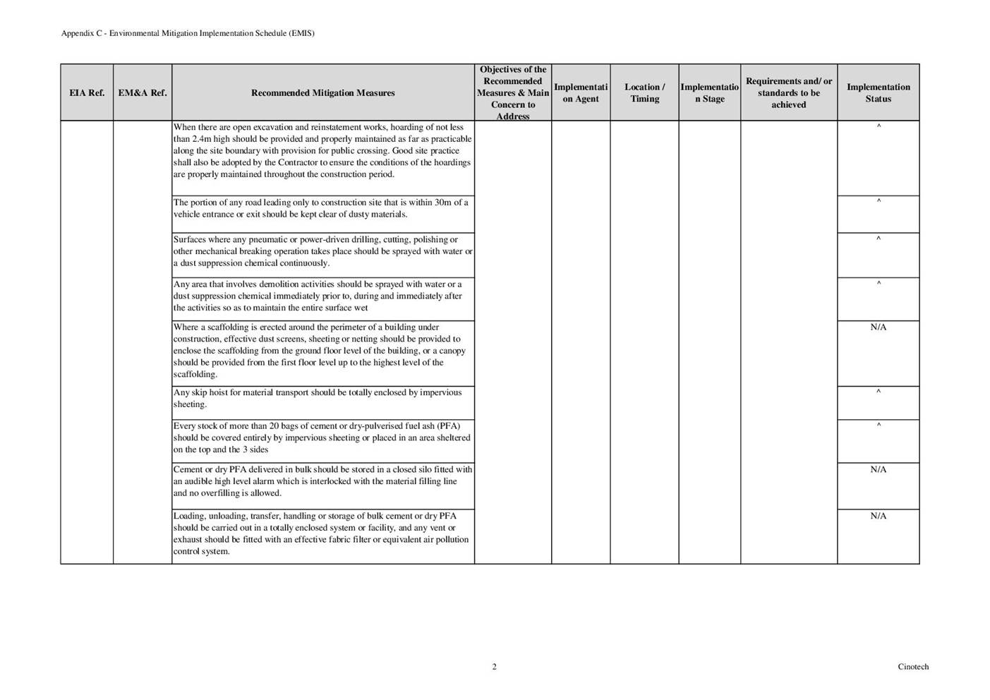 6.3 According to Environmental Permit, the approved EIA Report (Register No.: AEIAR-171/2013), and the EM&A Manual of the Project, the mitigation measures detailed in the documents are recommended to be implemented during the construction phase. An Environmental Mitigation Implementation Schedule (EMIS) is provided in Appendix C.