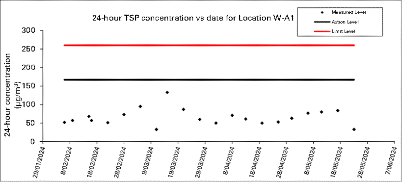 A.7 One Action Level of construction noise was triggered during the reporting month as documented complaints were received. No exceedance of Limit Level of construction noise was recorded in the reporting month. No exceedance of the Action and Limit Level of 24-hour TSP and 1-hour TSP was recorded in the reporting month.