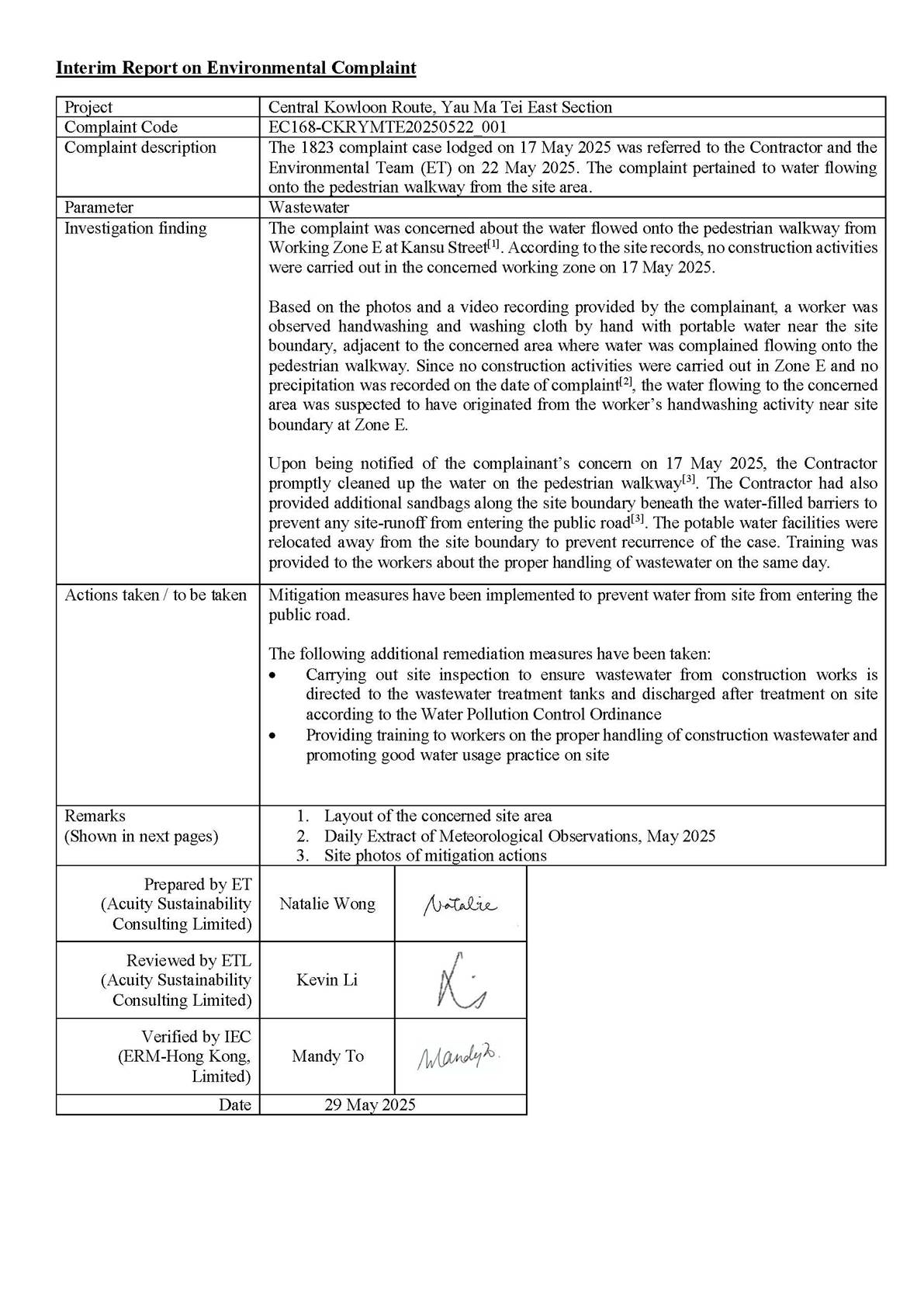 A.8 A total of three environmental complaints were received in the reporting month. After investigation with the Contractor, precautionary measures had been proposed to the Contractor by ET. The interim reports for the complaints are shown in Appendix Q.