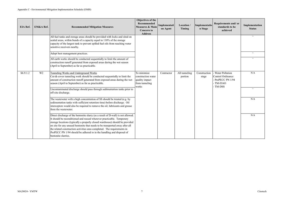 · Cut-&-cover tunnelling work should be conducted sequentially to limit the amount of construction runoff generated from exposed areas during the wet season (April to September) as far as practicable. · Uncontaminated discharge should pass through sedimentation tanks prior to off-site discharge; · The wastewater with a high concentration of SS should be treated (e.g. by sedimentation tanks with sufficient retention time) before discharge. Oil interceptors would also be required to remove oil, lubricants and grease from the wastewater; · Direct discharge of the bentonite slurry (as a result of D-wall) is not allowed. It should be reconditioned and reused wherever practicable. Temporary storage locations (typically a properly closed warehouse) should be provided on site for any unused bentonite that needs to be transported away after all the related construction activities area completed. The requirements in ProPECC PN 2/23 should be adhered to in the handling and disposal of bentonite slurries. |