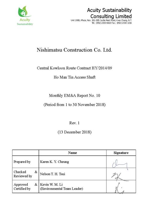 A.1 NISHIMATSU Construction Company Limited (“Contractor”) commenced the construction works of Highway Department (HyD) Central Kowloon Route Contract No. HY/2014/09 - Ho Man Tin Access Shaft (“The Project”) on 20 February 2018. This is the 10th monthly Environmental Monitoring and Audit (EM&A) report presenting the EM&A works carried out during the period from 1 November 2018 to 30 November 2018.