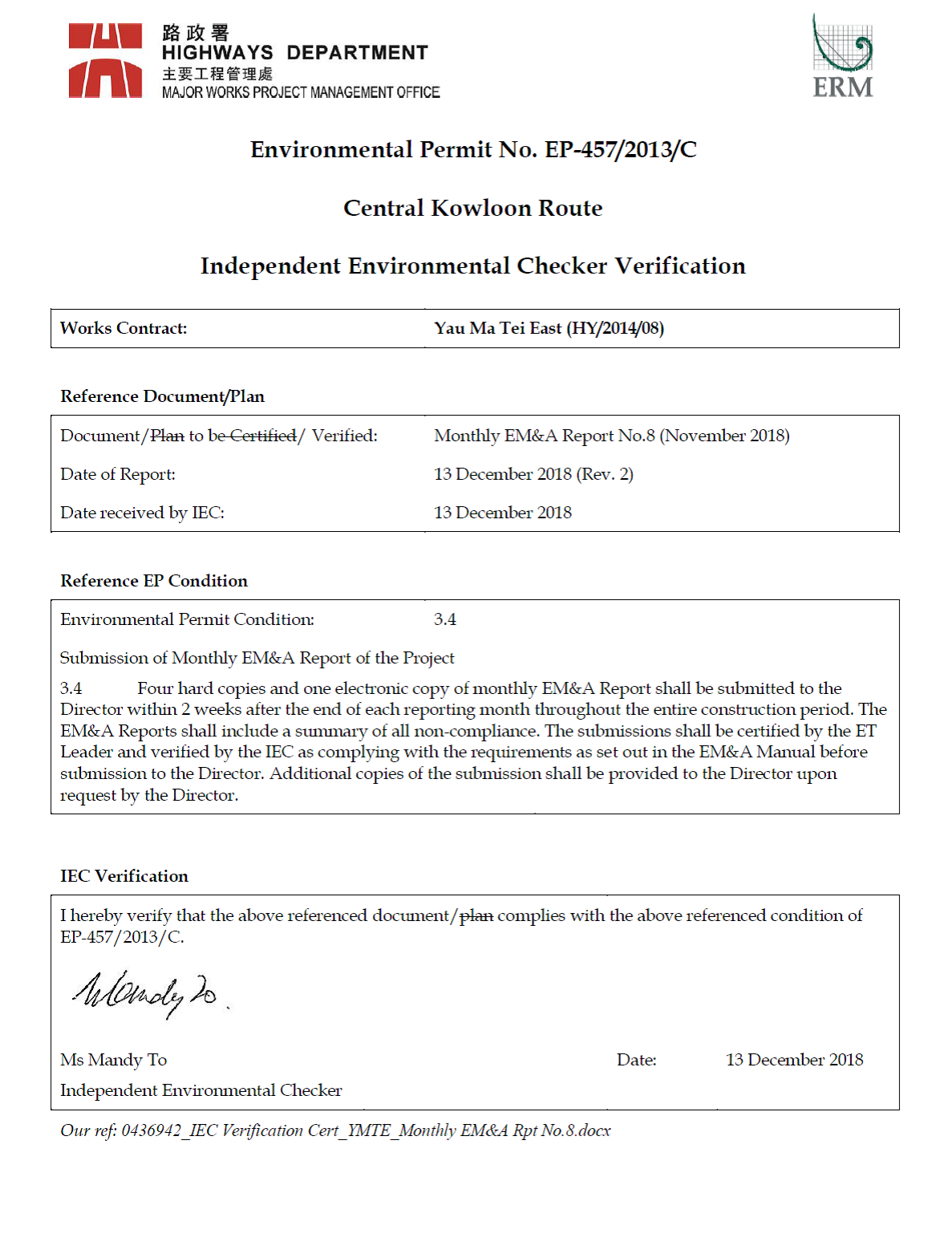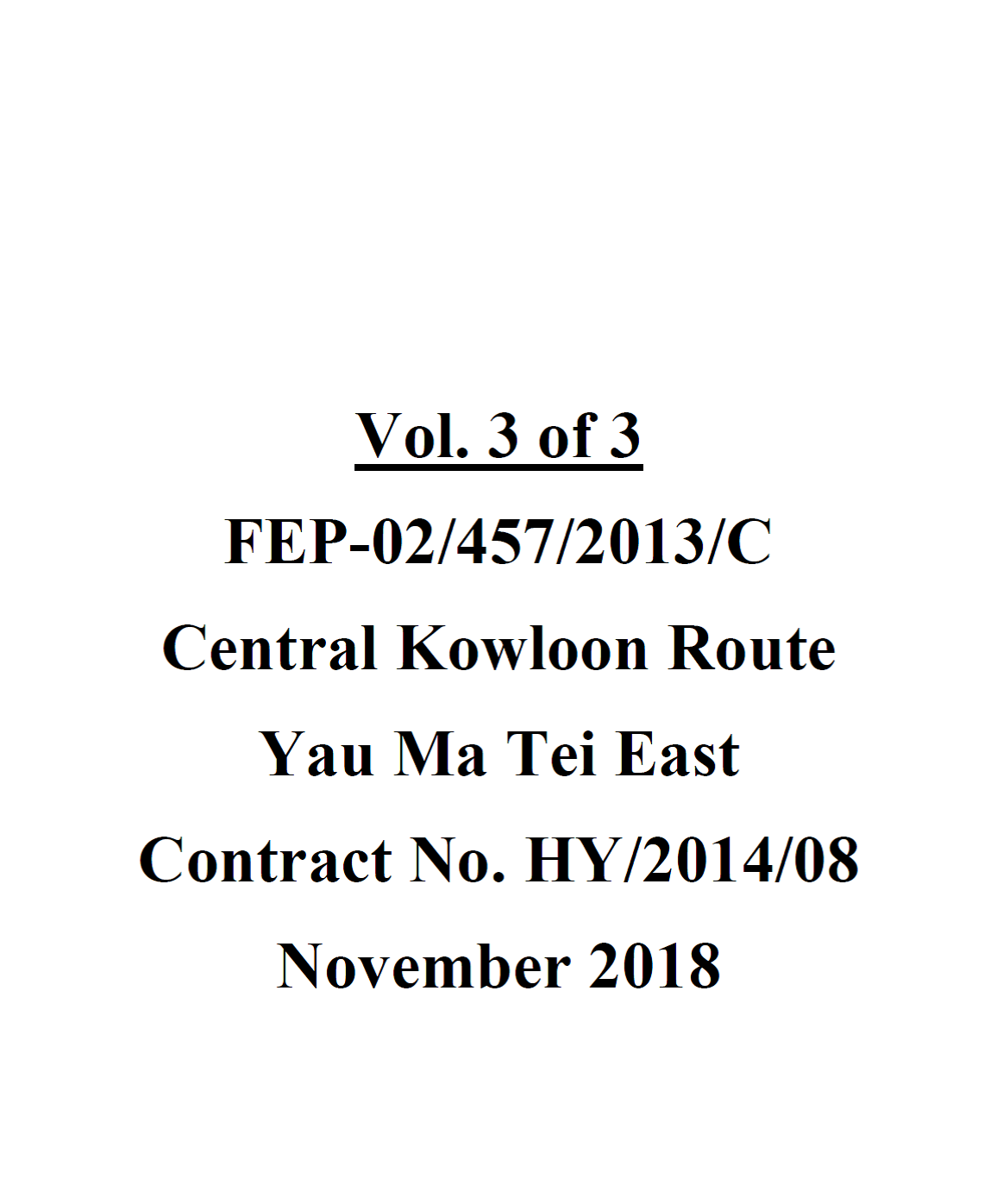 1.2. The Central Kowloon Route – Design and Construction Environmental Impact Assessment Report (Register No.: AEIAR-171/2013) was approved with conditions by the Environmental Protection Department (EPD) on 11 July 2013. An Environmental Permit (EP 457/2013) was issued on 9 August 2013. Variations of EP (VEP) was subsequently applied for and the latest EP (EP-457/2013/C) was issued by EPD on 16 January 2017. A Further EP (FEP-02/457/2013/C) was issued by EPD on 5 March 2018.