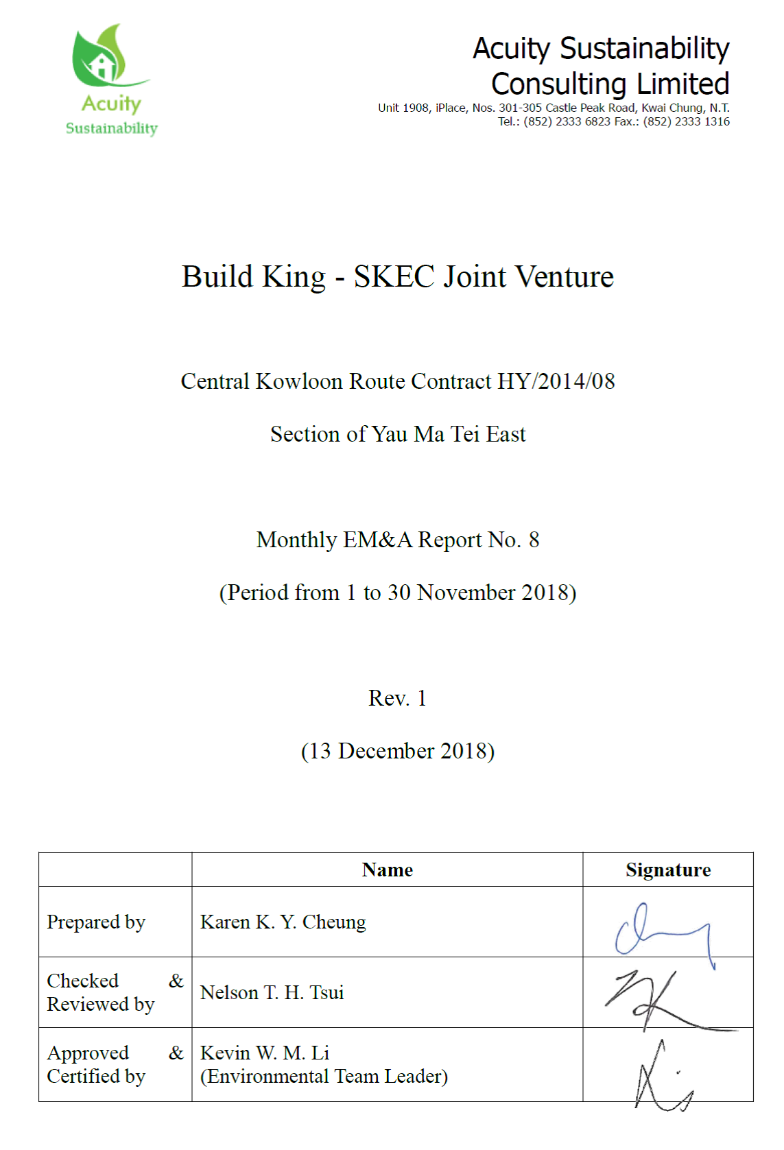 A.1 Build King – SKEC Joint Venture (“Contractor”) commenced the construction works of Highway Department (HyD) Central Kowloon Route Contract No. HY/2014/08 – Section of Yau Ma Tei East (“The Project”) on 20 April 2018. This is the 8th monthly Environmental Monitoring and Audit (EM&A) report presenting the EM&A works carried out during the period from 1 November 2018 to 30 November 2018.