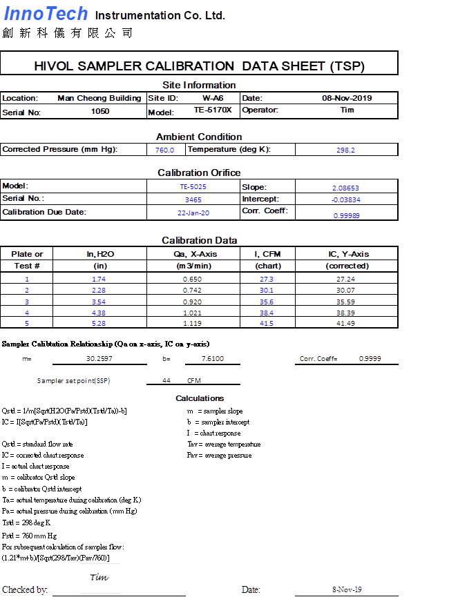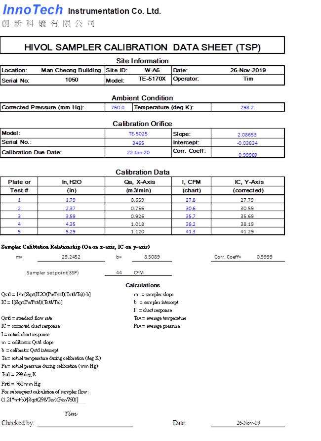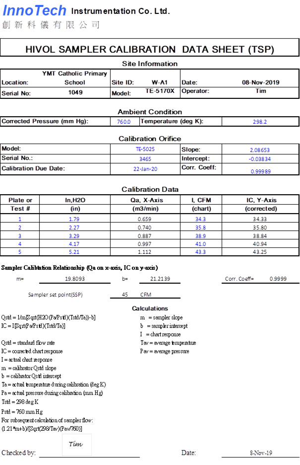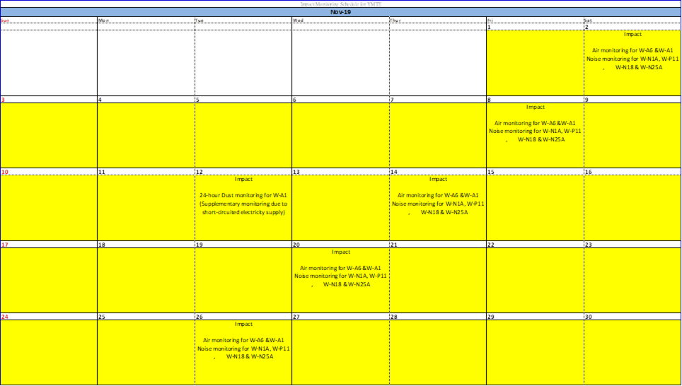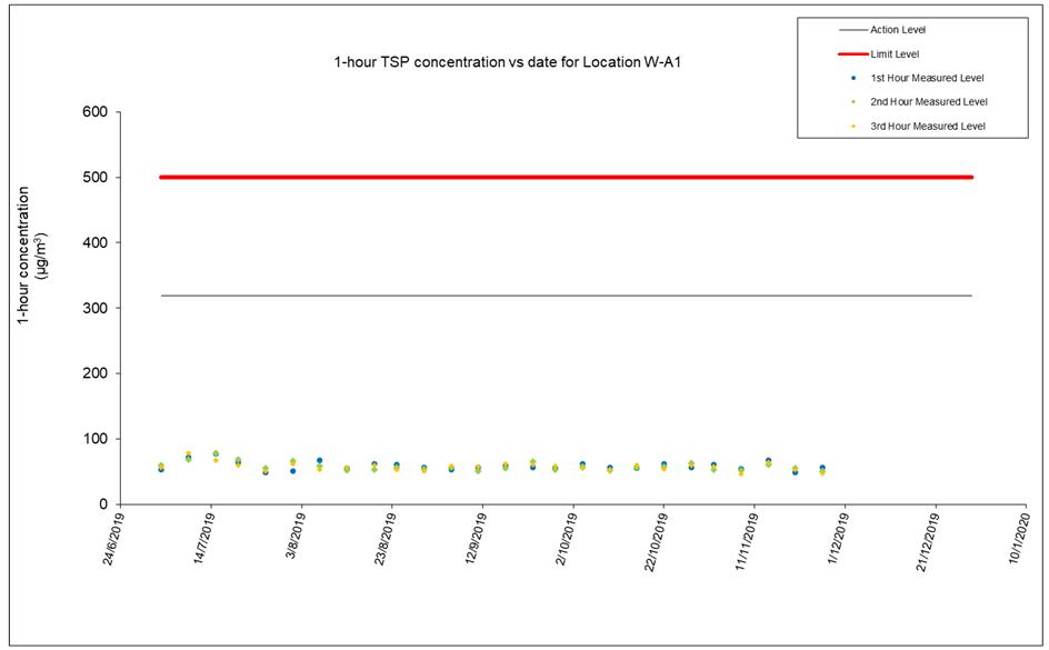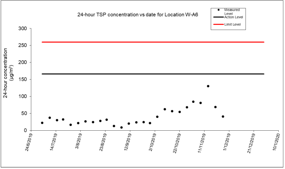 A.4 Due to the short-circuited electricity supply for HVS equipment on 8 November 2019 at Yau Mai Tei Catholic primary School (Hoi Wang Road) (W-A1), 24-hour TSP dust monitoring was suspended. Contact was made with Contractor for immediate follow up on 11 November 2019. Equipment inspection was conducted and the problem was fixed. Supplementary 24-hour TSP dust monitoring was conducted on 12 November 2019.