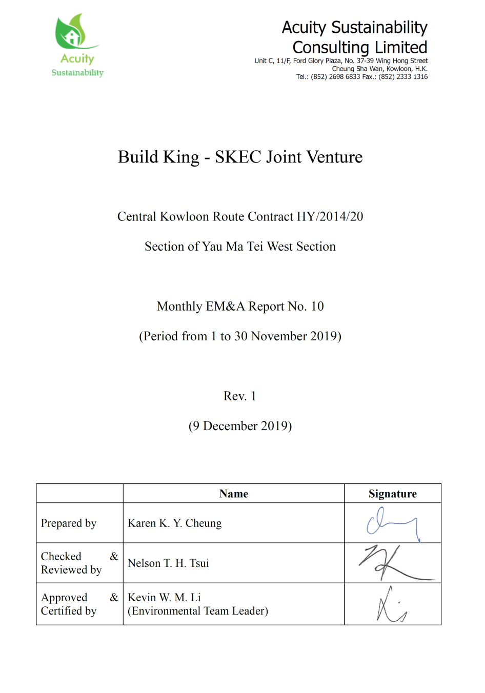 A.1 Build King – SKEC Joint Venture (“Contractor”) commenced the construction works of Highway Department (HyD) Central Kowloon Route Contract No. HY/2014/20 – Section of Yau Ma Tei West (“The Project”) on 12 February 2019. This is the 10th monthly Environmental Monitoring and Audit (EM&A) report presenting the EM&A works carried out during the period from 1 November 2019 to 30 November 2019.