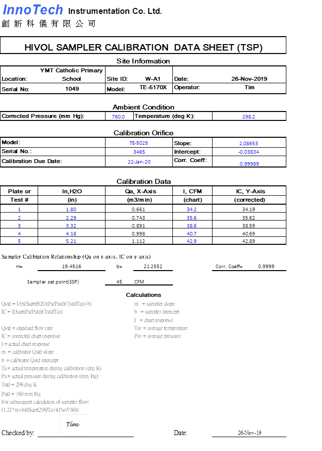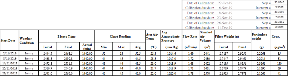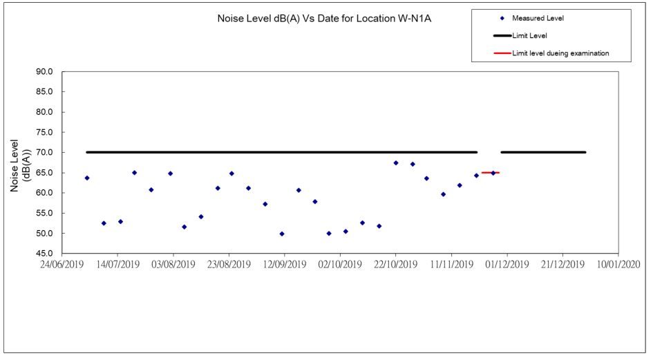 A.4 Due to the short-circuited electricity supply for HVS equipment on 8 November 2019 at Yau Mai Tei Catholic primary School (Hoi Wang Road) (W-A1), 24-hour TSP dust monitoring was suspended. Contact was made with Contractor for immediate follow up on 11 November 2019. Equipment inspection was conducted and the problem was fixed. Supplementary 24-hour TSP dust monitoring was conducted on 12 November 2019.