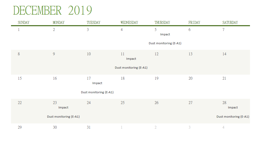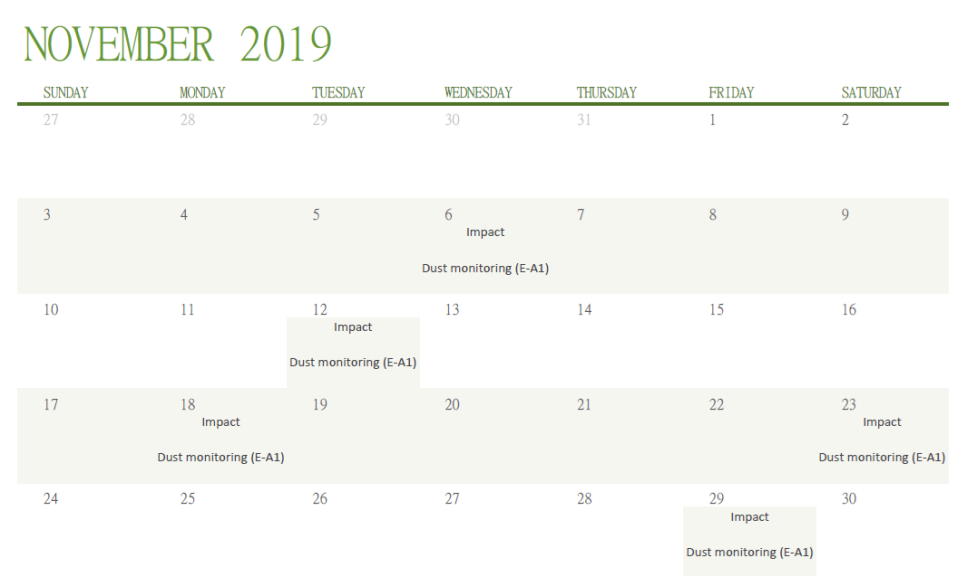 A.7 Joint weekly site inspections were conducted by representatives of the Contractor, Engineer and Contractor’s ET on 6, 13, 20, 27 November 2019. Details of the audit findings and implementation status are presented in Section 5.