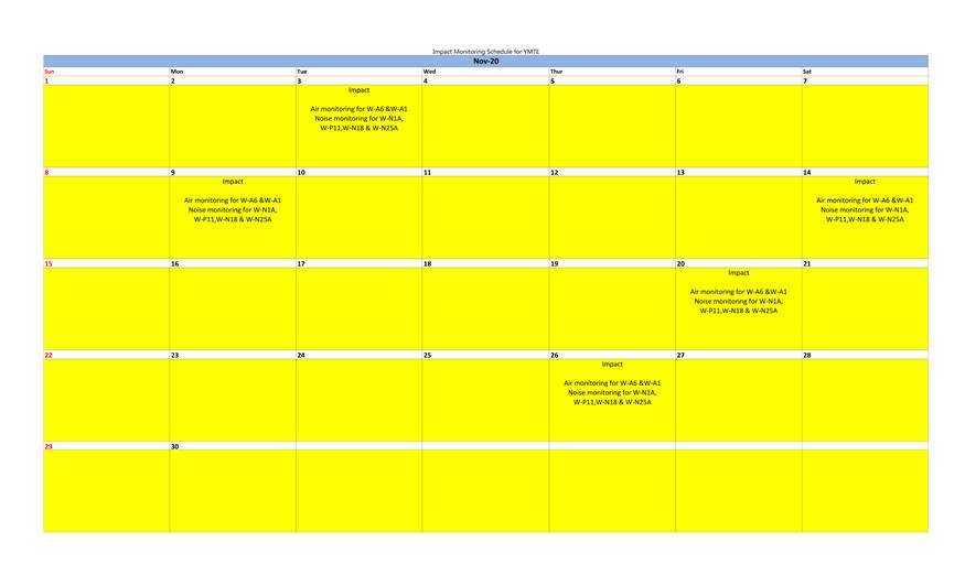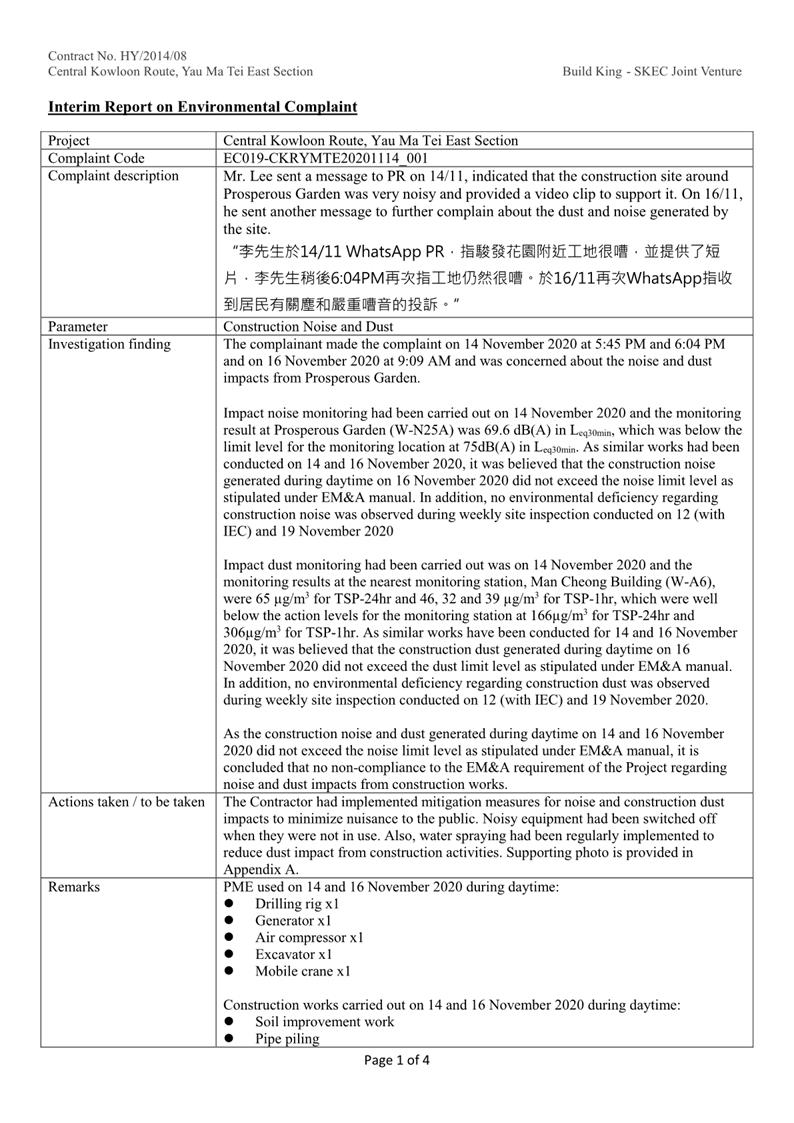 A.8 One noise and dust-related complaint was received in the reporting month on 14 November 2020. After investigation with Contractor, precautionary measures had been proposed to the Contractor by ET. The interim reports for the complaint is shown in Appendix Q.