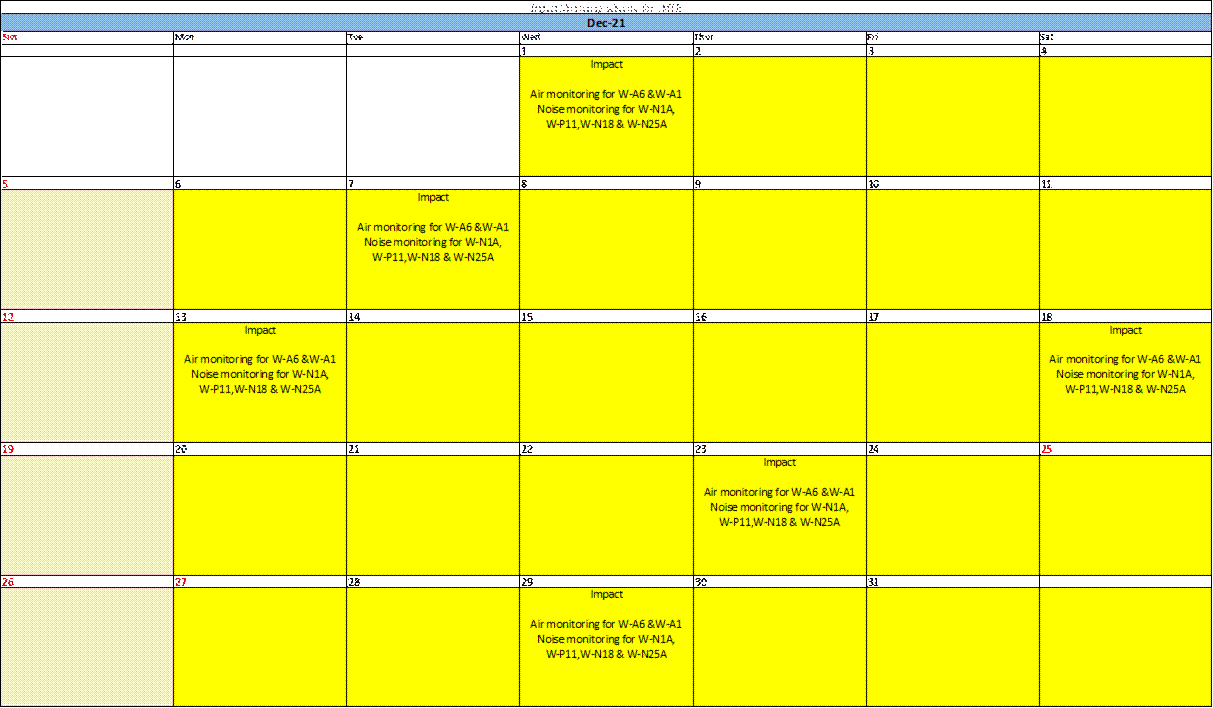 A.5 Joint weekly site inspections were conducted by representatives of Environmental Team (ET), Contractor and Engineer on 4, 11, 18 and 25 November 2021. One joint site inspection with IEC was also undertaken on 11 November 2021. Details of the audit findings and implementation status are presented in Section 5.