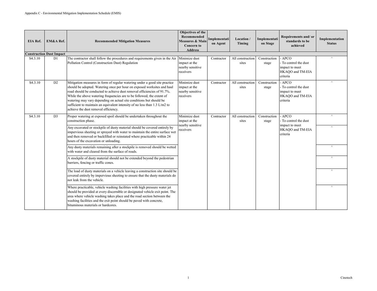3. According to Environmental Permit, the approved EIA Report (Register No.: AEIAR-171/2013), and the EM&A Manual of the Project, the mitigation measures detailed in the documents are recommended to be implemented during the construction phase. An Environmental Mitigation Implementation Schedule (EMIS) is provided in Appendix C.
