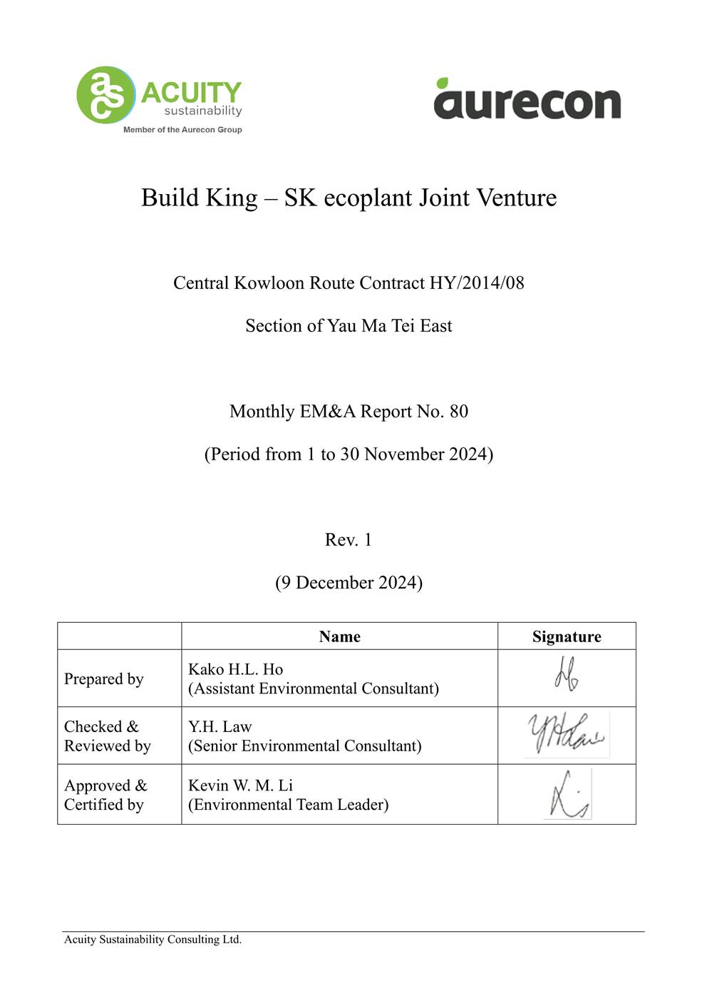 A.1 Build King – SK ecoplant Joint Venture (“Contractor”) commenced the construction works of Highway Department (HyD) Central Kowloon Route Contract No. HY/2014/08 – Section of Yau Ma Tei East (“The Project”) on 20 April 2018. This is the 80th monthly Environmental Monitoring and Audit (EM&A) report presenting the EM&A works carried out during the period from 1 November 2024 to 30 November 2024.