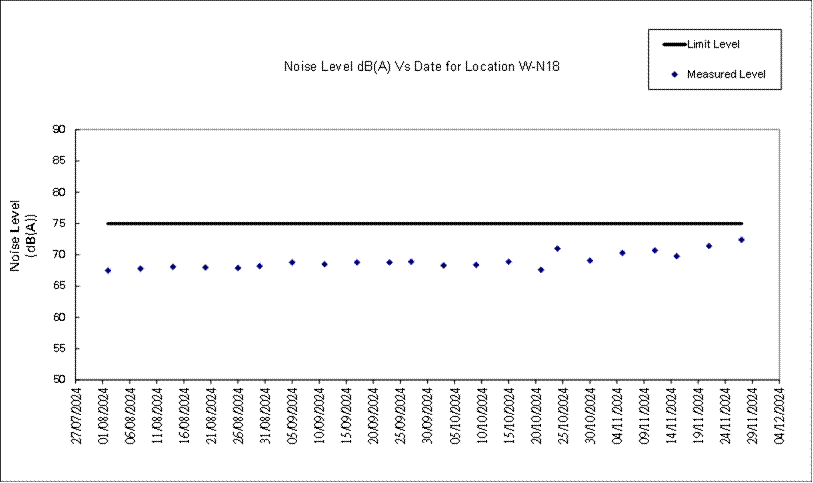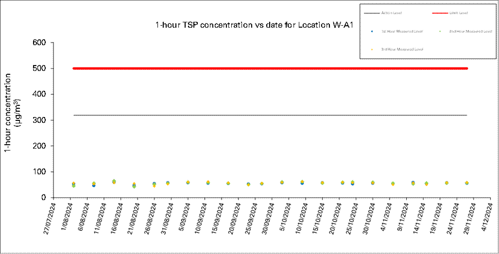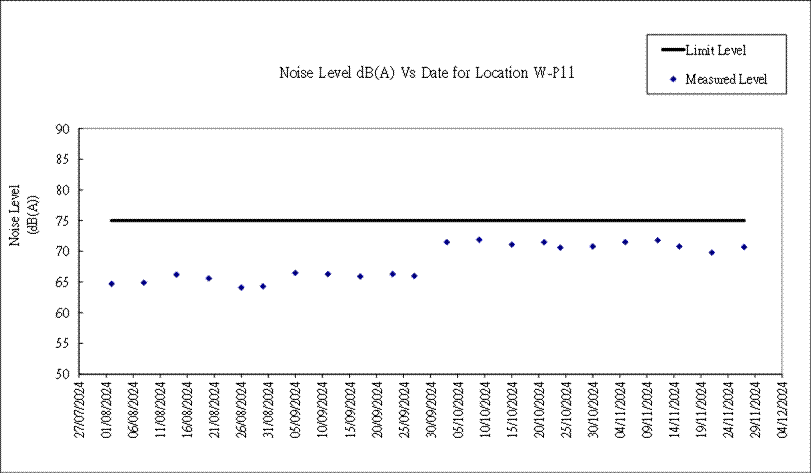 A.7 Five Action Level of construction noise were triggered during the reporting month as documented complaints were received. No exceedance of Limit Level of construction noise was recorded in the reporting month. No exceedance of the Action and Limit Level of 24-hour TSP and 1-hour TSP was recorded in the reporting month.