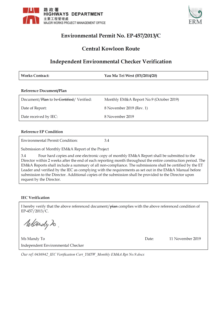 1.2. The Central Kowloon Route – Design and Construction Environmental Impact Assessment Report (Register No.: AEIAR-171/2013) was approved with conditions by the Environmental Protection Department (EPD) on 11 July 2013. An Environmental Permit (EP 457/2013) was issued on 9 August 2013. Variations of EP (VEP) was subsequently applied for and the latest EP (EP-457/2013/C) was issued by EPD on 16 January 2017.