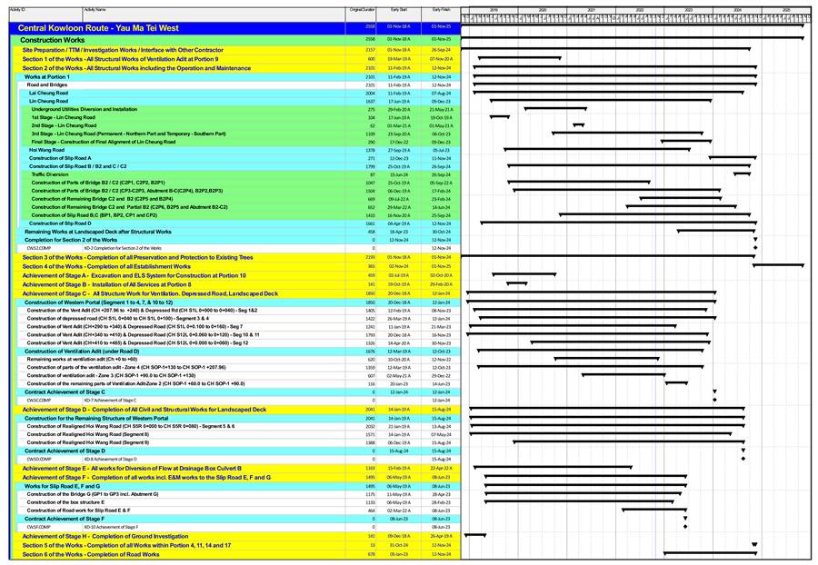 · Pre-drilling Works at Portion 1B and 1D · Socket H-Pile (Landscaped Deck and Bridges) at Portion 1B and 1D · Noise Barrier C02, C03 & S01 (along Lin Cheung Road) at Portion 1E · Bridge Deck Construction at Bridge C2 Deck 3 at Portion 1E and 1B · Bridge Deck Construction at Bridge B2 Deck 2 at Portion 1E and 1B · Bridge Deck Construction at Bridge C Deck 2 and Bridge B Deck 1 at Portion 1E and 1B · Abutment B-C construction at Portion 1B · Bridge D construction at Portion 1E · Vent. Adit Ch 175~240 at Zone 4B, 4C and A1 at Portion 1E · Parapet Wall Construction at Bridge G at Portion 1B · Abutment Wall Construction at Slip Road E at Portion 1B · Excavation and Lateral Support Works (Segment 4, 7, 10 to 12) for Vent. Adit and Depressed Road Construction including Escape Route Staircase No. 1 to 3 at Portion 1F and 10 · Vent Adit Ch 280~290 at Segment 4 at Portion 1D · Vent Adit Ch 300~360 at Segments 7 & 10 including Road Slab at Portion 1F · Vent Adit Ch 360~410 at Segment 11 including Road Slab at Portion 1F · Elevated Hoi Wang Road at Portion 1D · Landscaped Construction at Segment 7 at Portion 1D · Pile Cap, Wall and Column Construction along Hoi Wang Road (Segment 5, 6, 7, 8 and 9) at Portion 1D |