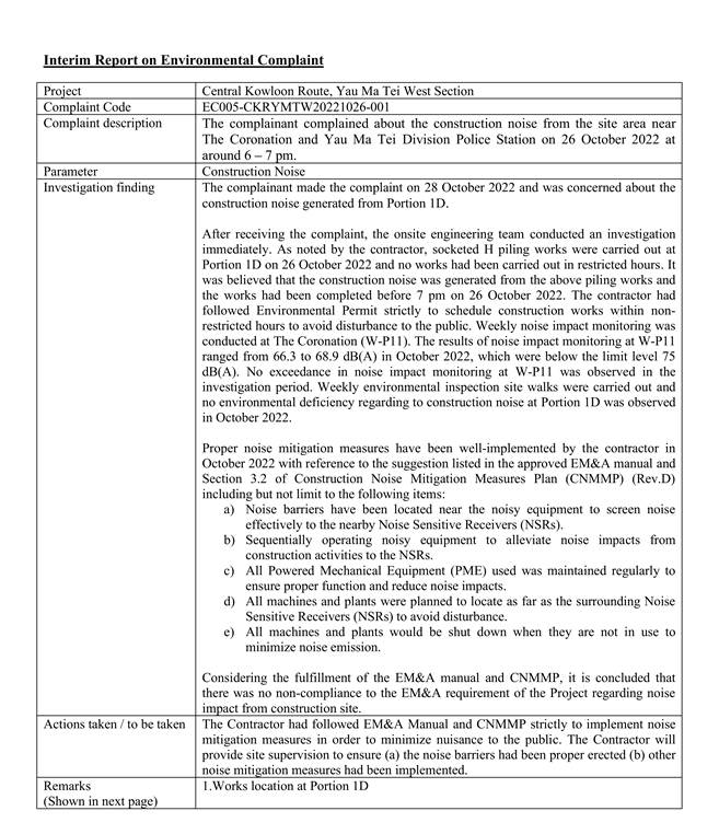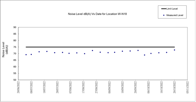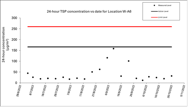 A.7 One Action Level of construction noise weas triggered during the reporting period as a documented complaint was received on 28 October 2022 related to construction noise from works areas at Portion 1D. No exceedance of Limit Level of construction noise was recorded in the reporting month. No exceedance of the Action and Limit Level of 24-hour TSP and 1-hour TSP was recorded in the reporting month.