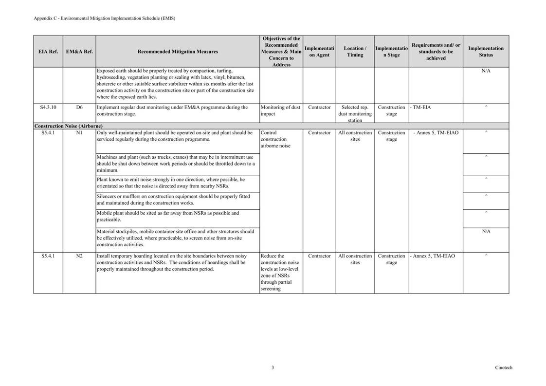 6.3 According to Environmental Permit, the approved EIA Report (Register No.: AEIAR-171/2013), and the EM&A Manual of the Project, the mitigation measures detailed in the documents are recommended to be implemented during the construction phase. An Environmental Mitigation Implementation Schedule (EMIS) is provided in Appendix C.