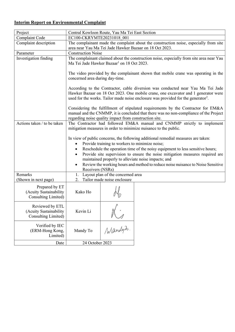 A.8 A total of four environmental complaints were received in the reporting month. After investigation with Contractor, precautionary measures had been proposed to the Contractor by ET. The interim reports for the complaints are shown in Appendix Q.